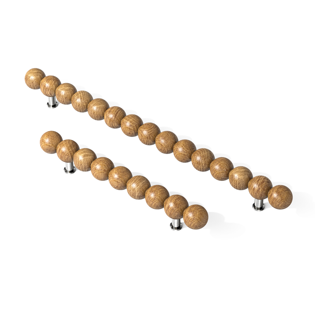 Мебельная ручка-скоба Atlas HL-071M представляет собой уникальное архитектурное решение, объединяющее функциональность классической рейлинговой ручки с выразительной скульптурной формой. Изделие состоит из ряда точеных сферических элементов из массива дуба диаметром 28 миллиметров, нанизанных на металлическую основу и образующих горизонтальную композицию длиной 240 миллиметров. Такое конструктивное решение создает объемную фактуру, которая привлекает внимание и становится выразительным декоративным акцентом мебельных фасадов.