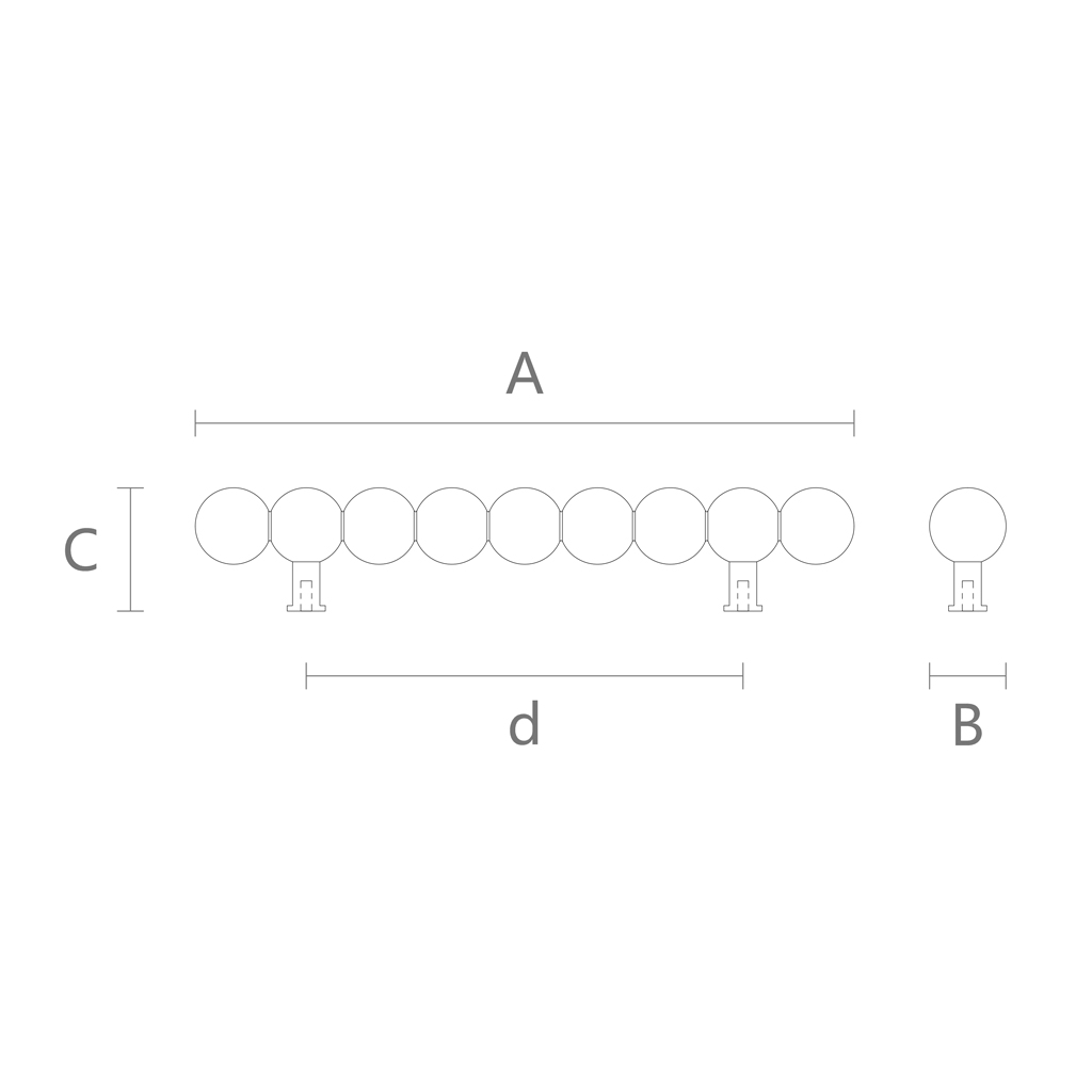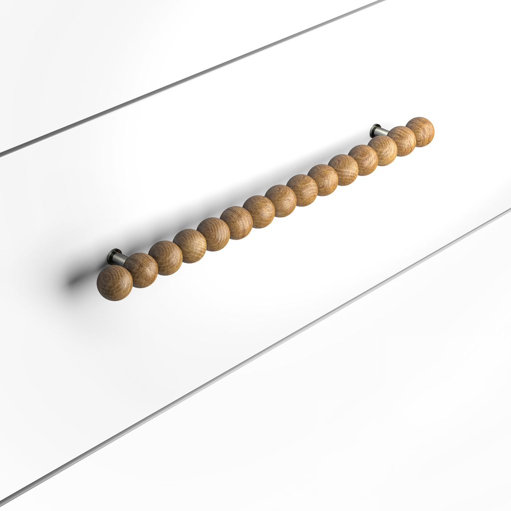 Общая длина ручки составляет 240 миллиметров, что делает её универсальным решением для средних и крупных мебельных фасадов. На этой длине размещается ряд деревянных сфер, создающих ритмичную композицию. Межосевое расстояние 160 миллиметров между точками крепления соответствует стандартным размерам, применяемым в мебельной индустрии, что упрощает замену существующей фурнитуры без необходимости сверления новых отверстий. Высота выступа 45 миллиметров обеспечивает достаточное пространство для комфортного захвата рукой.