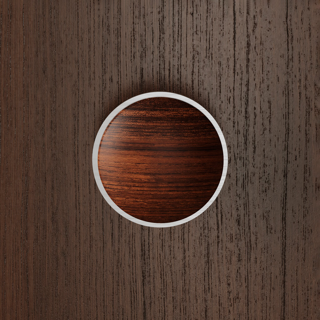 Текстура палисандра отличается средней до крупной зернистостью с выраженным природным блеском. На поверхности ручки размером 54 × 54 мм рисунок древесины раскрывается во всей красе, демонстрируя характерные для породы цветовые переходы и мраморные разводы. После качественной полировки поверхность приобретает шелковистое сияние, которое подчеркивает глубину цвета и сложность природного узора. Каждая ручка уникальна благодаря индивидуальному расположению волокон.