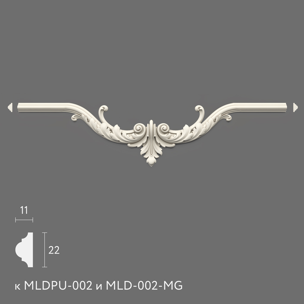 Модель NPU.VRS-002-1 — это декоративная накладка, выполненная в классическом стиле. Она имеет центральную часть с растительным орнаментом и завитками, которые плавно переходят в горизонтальные участки, предназначенные для стыковки с молдингами или другими элементами декора. Основные параметры: