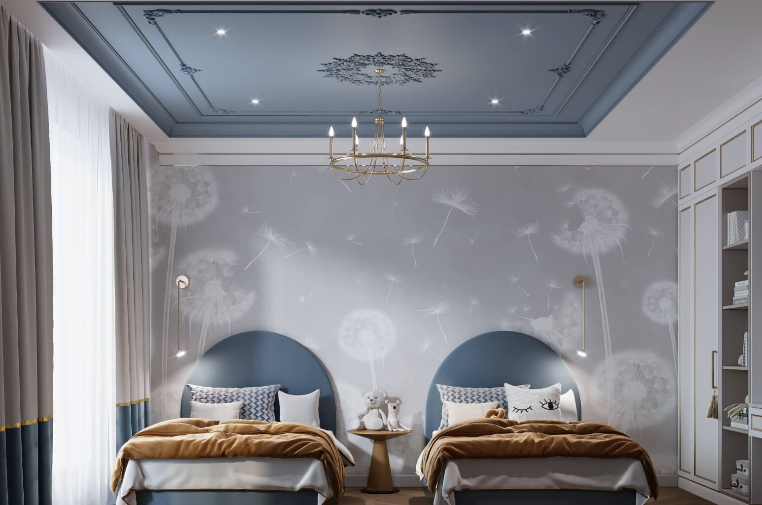 Для комнаты подростка классический потолок — долговечное решение: тренды в оформлении подростковых интерьеров меняются, а карниз с молдинговым контуром остаётся актуальным при любом цвете стен и любой мебели.