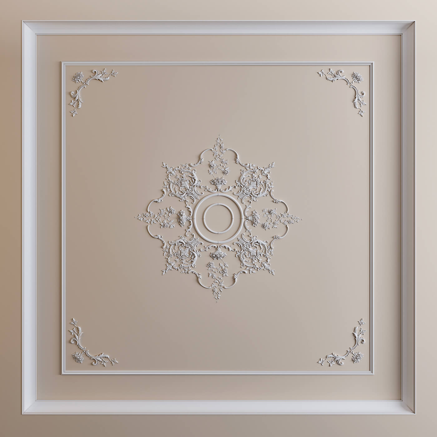 Розетка под люстру. Потолочные розетки под точку крепления люстры — дополнительный концентрический уровень детализации внутри центральной системы MLDPU-027. Декоративная розетка диаметром 200–300 мм, установленная внутри малого угла MLDPU-027U-2 (124 × 124 мм), создаёт финальную концентрическую точку всей системы.