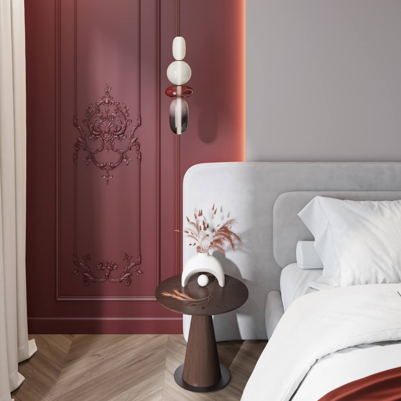 Четыре уровня угловых акцентов в мастер-спальне с потолком 3+ метра — это не перегрузка, это точное попадание в масштаб. Угловые группы CPU-P6 при правильном освещении создают в углах зоны «башни» из орнаментальных ярусов — визуально грандиозный эффект, который придаёт пространству дворцовую торжественность без кичливой помпезности.