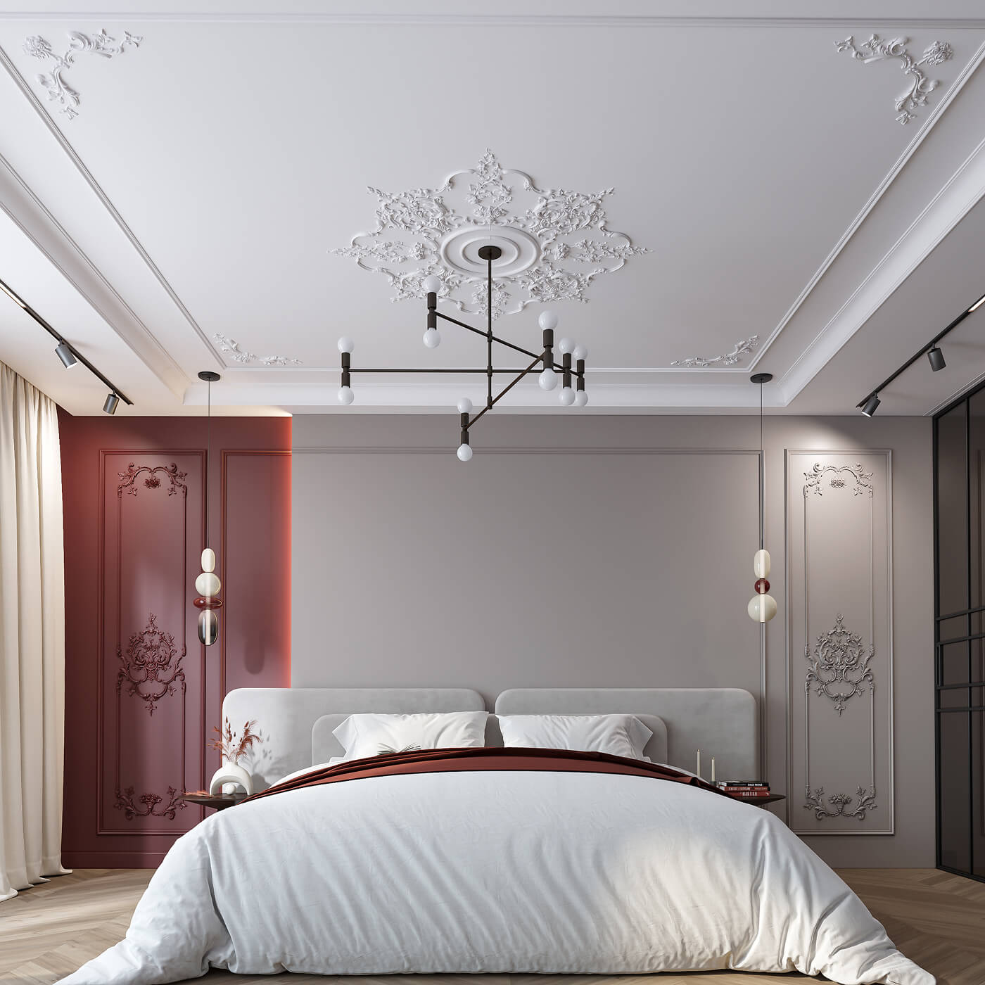 Комплект лепного декора для мастер-спальни — один из наиболее востребованных сценариев применения CPU-P6. Мастер-спальня в большом доме или просторной квартире — это помещение, которое сочетает камерность личного пространства с представительским уровнем отделки. В ней можно позволить себе роскошь, которая в стандартной спальне была бы избыточной.