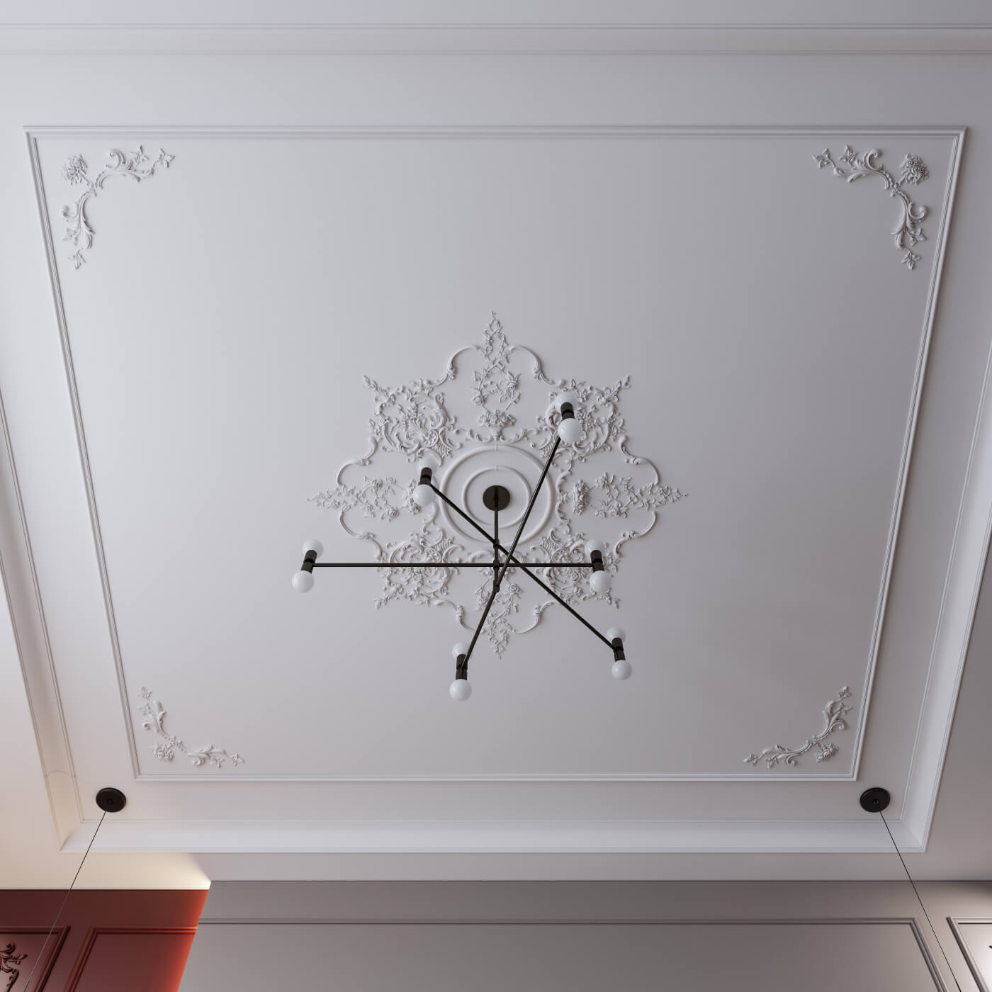 Люстра под такой системой получает архитектурную рамку в несколько концентрических уровней. При монохромной покраске разница уровней читается через тени — тихо, но убедительно. При контрастном акцентировании (золото или кремовый оттенок на центральных элементах при белом карнизе) — намеренно, торжественно, дворцово.