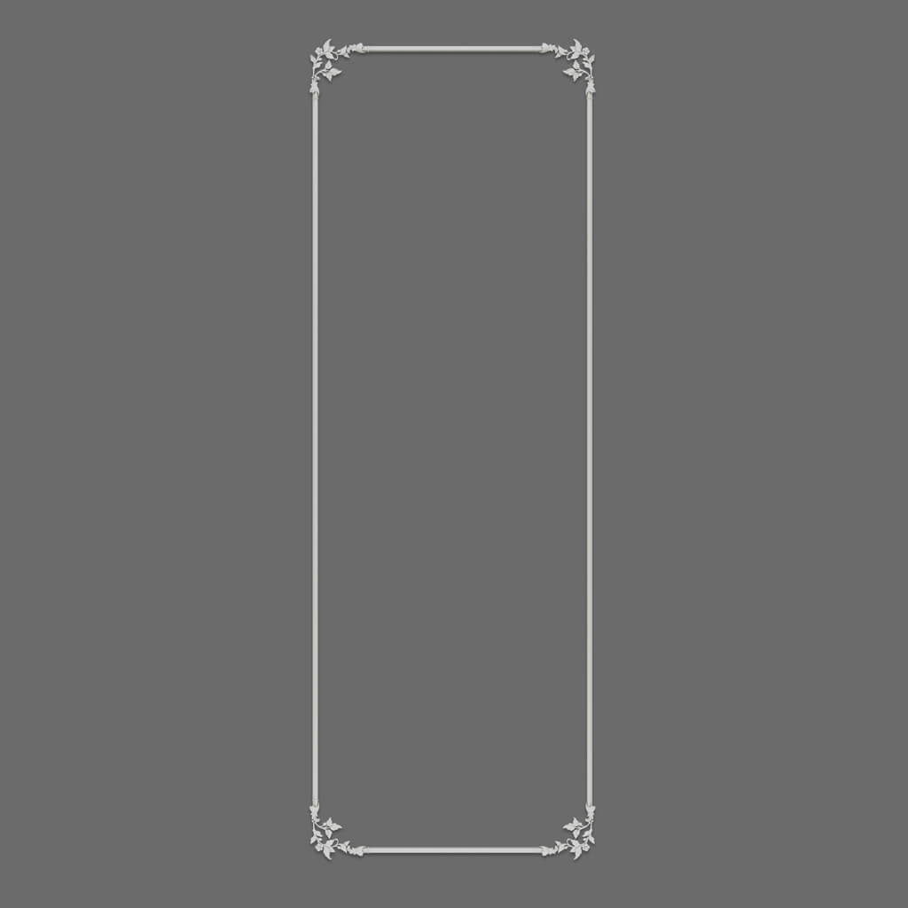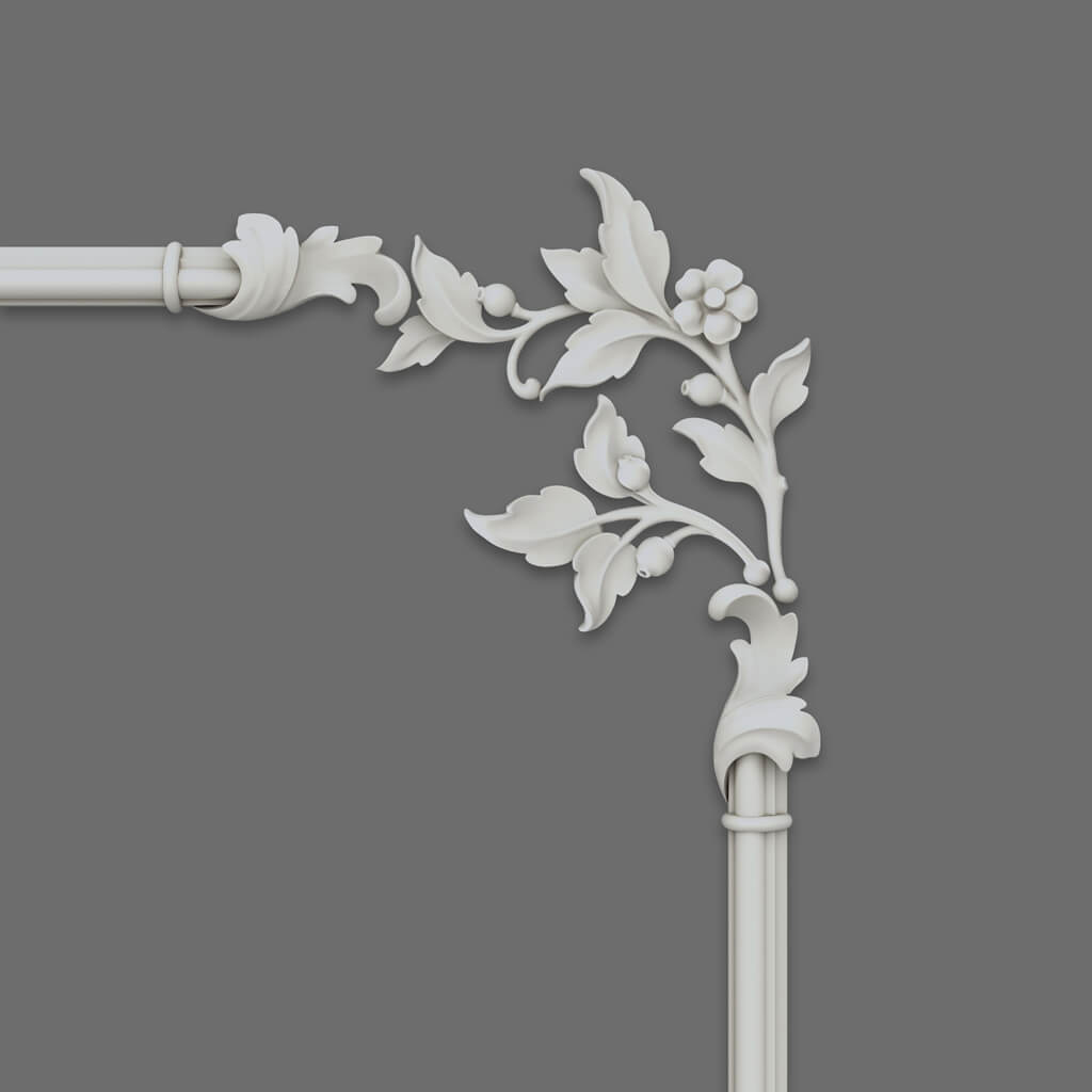 Тонкий МДФ-молдинг образует чёткий архитектурный контур — лаконичный, выверенный, без лишних сантиметров. Он задаёт рамку так, как делает это опытный дизайнер: уверенно, без украшательства ради украшательства. Внутри этой рамки — декоративные элементы из полиуретана с растительным орнаментом, разработанным в рамках коллекции «Ботанический сад»: изящные листья, мягкие природные изгибы, живой рельеф. Растительный декор располагается по углам рамки, создавая эффект интерьерного гравюрного орнамента — изысканного, но не помпезного.