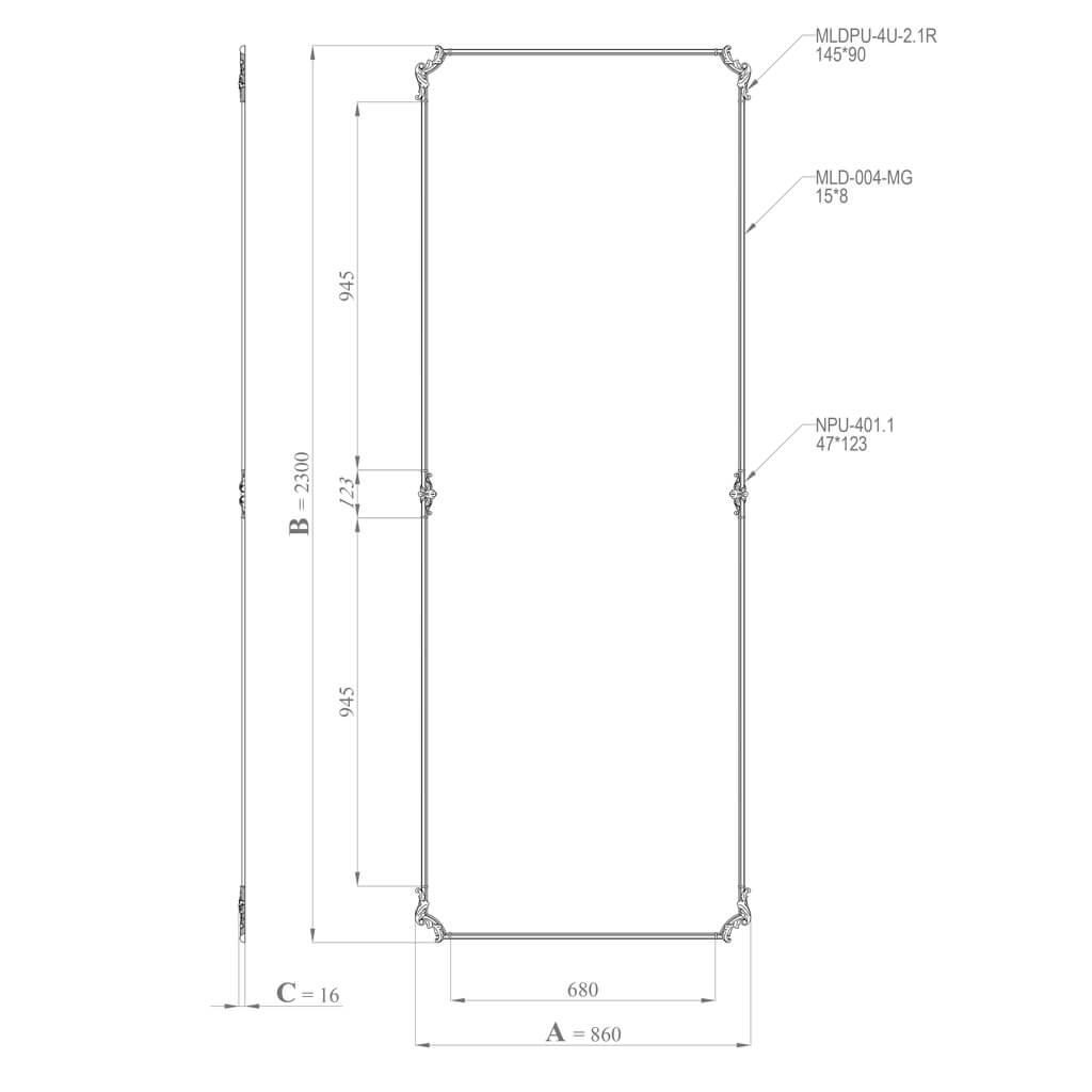 Если снять с артикула техническую оболочку и посмотреть на суть, CPU-9-2 — это вертикальная декоративная рамка высотой 2300 мм и шириной 860 мм с угловыми орнаментальными накладками и двумя центральными вставками по оси симметрии.