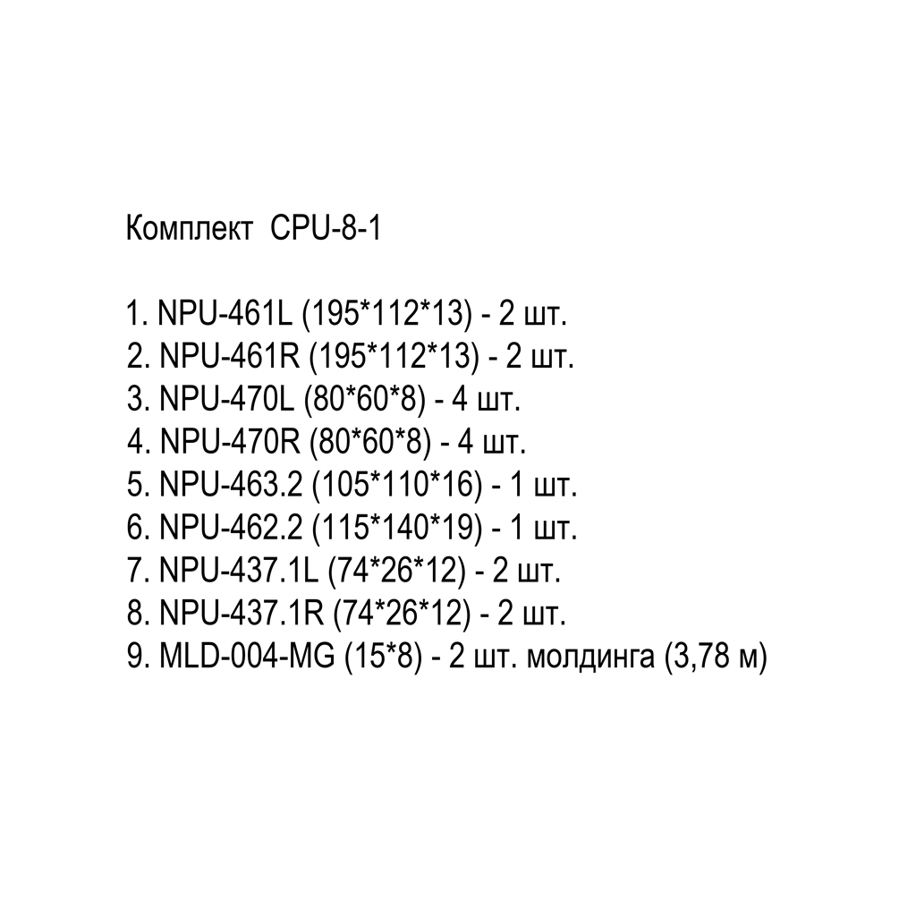 Комплект CPU-8-1 создаёт вертикальную декоративную панель с габаритными размерами 430 × 2300 мм и максимальной глубиной рельефа 19 мм — центральный медальон NPU-462.2. Полный компонентный состав: молдинг МДФ грунтованный MLD-004-MG, профиль 15 × 8 мм, длина 2600 мм — одна единица; лепной декор полиуретановый NPU-461L, размер 195 × 112 × 13 мм — одна штука; лепной декор полиуретановый NPU-461R, размер 195 × 112 × 13 мм — одна штука; лепнина полиуретановая NPU-437.1L, размер 74 × 26 × 12 мм — одна штука; лепнина полиуретановая NPU-437.1R, размер 74 × 26 × 12 мм — одна штука; лепной декор полиуретановый NPU-462.2, размер 115 × 140 × 19 мм — одна штука; лепной декор полиуретановый NPU-463.2, размер 110 × 105 × 16 мм — одна штука; лепной декор полиуретановый NPU-470L, размер 80 × 60 × 8 мм — одна штука; лепной декор полиуретановый NPU-470R, размер 80 × 60 × 8 мм — одна штука. Итого: девять штучных изделий по девяти номенклатурным позициям. Все орнаментальные полиуретановые элементы поставляются с заводской белой акриловой грунтовкой. Молдинг МДФ — с грунтовкой «Престиж» (детальная ручная шлифовка). Материал несущего молдинга — МДФ средней плотности. Материал орнаментальных декоров — жёсткий полиуретан высокой плотности.