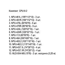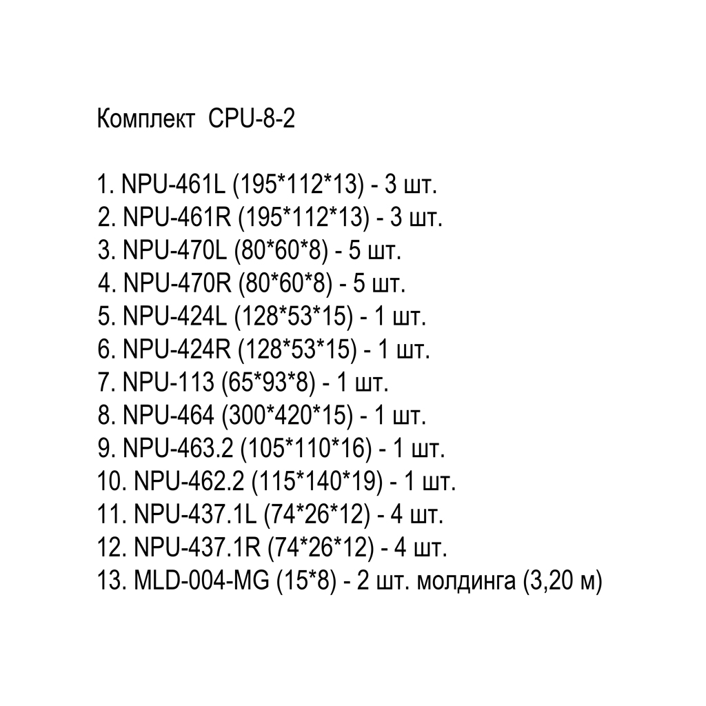 Комплект CPU-8-2 создаёт вертикальную декоративную панель с габаритными размерами 430 × 2300 мм и максимальной глубиной рельефа 19 мм (NPU-462.2). Полный состав: молдинг МДФ грунтованный MLD-004-MG (15×8×2600 мм) — одна единица; NPU-461L (195×112×13 мм) — две штуки; NPU-461R (195×112×13 мм) — две штуки; NPU-113 (65×93×8 мм) — одна штука; NPU-437.1L (74×26×12 мм) — две штуки; NPU-437.1R (74×26×12 мм) — две штуки; NPU-462.2 (115×140×19 мм) — одна штука; NPU-464 (300×420×15 мм) — одна штука; NPU-463.2 (110×105×16 мм) — одна штука; NPU-470L (80×60×8 мм) — две штуки; NPU-470R (80×60×8 мм) — две штуки; NPU-424L (128×53×15 мм) — одна штука; NPU-424R (128×53×15 мм) — одна штука. Итого: тринадцать номенклатурных позиций, восемнадцать штучных изделий. Максимальный рельеф системы: 19 мм (NPU-462.2). Все полиуретановые элементы — заводская белая акриловая грунтовка. Молдинг МДФ — грунтовка «Престиж» (детальная ручная шлифовка).