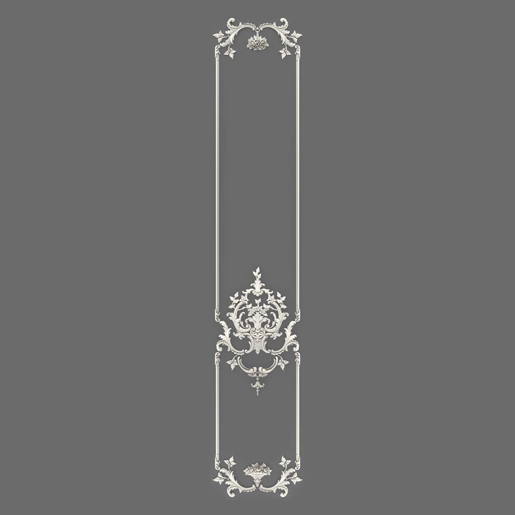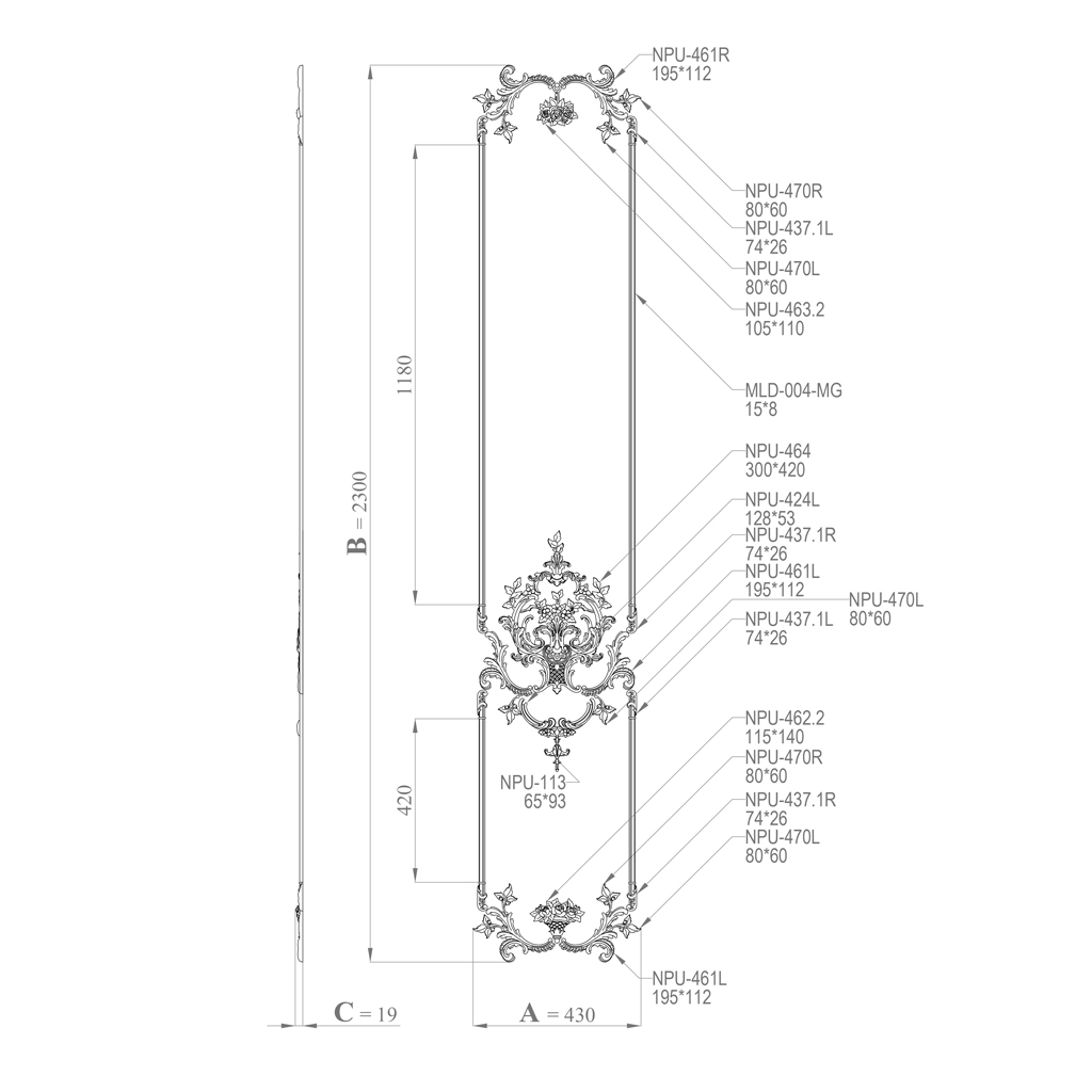 Вертикально ориентированные пропорции 300 × 420 мм с соотношением сторон примерно 1:1,4 помещают NPU-464 в категорию «вытянутых портретных» декоративных форм — тех, что в классическом интерьере применялись для центральных медальонов стеновых секций, для декоративных картушей над каминными порталами, для орнаментальных вставок в дверные и оконные обрамления. Высота 420 мм — почти полметра — означает, что при взгляде на готовую панель с расстояния двух-трёх метров NPU-464 занимает доминирующее место в поле зрения и воспринимается как полноценный декоративный объект — медальон, картуш, орнаментальное панно, а не деталь общей системы. Именно эта способность быть воспринятым как самостоятельный декоративный объект при одновременной органичной встроенности в систему панели является высшим архитектурным достоинством элемента.