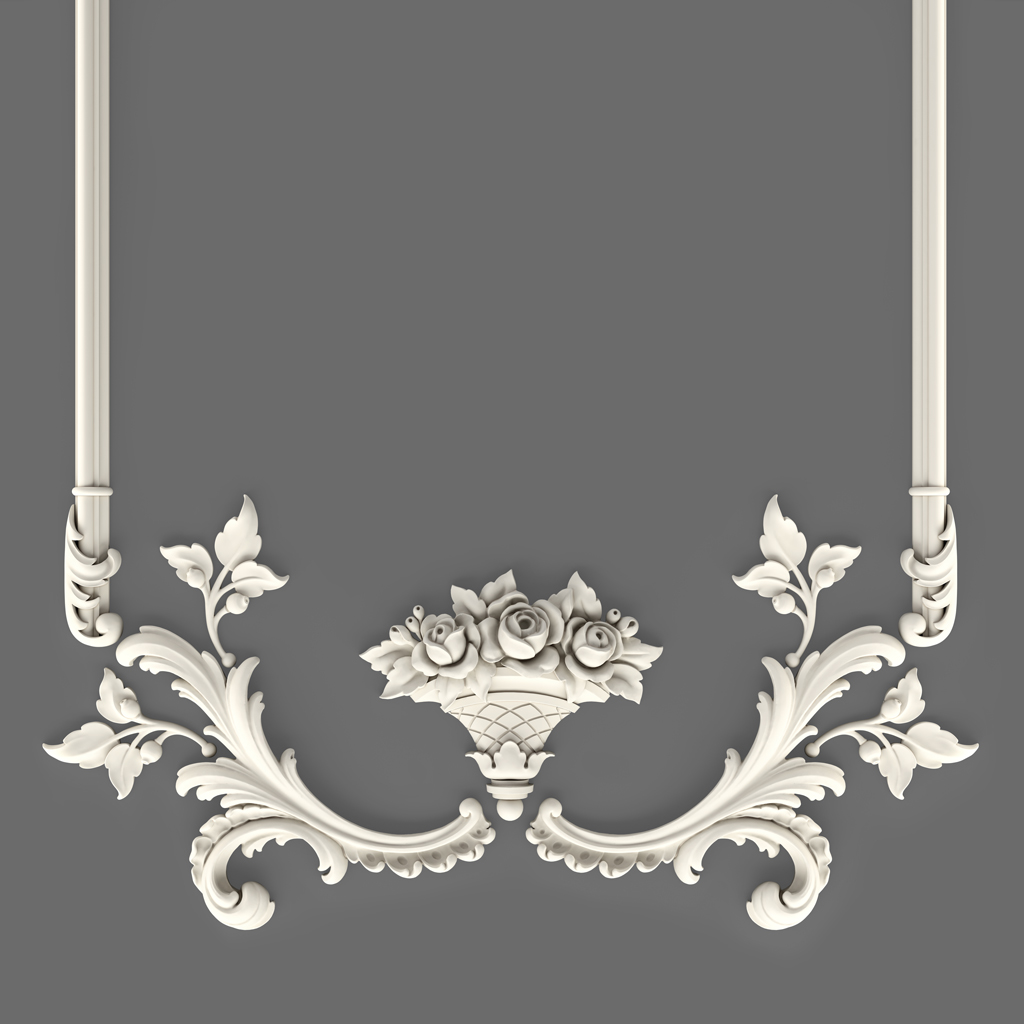 Лепной декор NPU-464 размером 300 × 420 × 15 мм является безусловной и безоговорочной декоративной доминантой комплекта CPU-8-2. Его абсолютные размеры — 30 сантиметров в ширину и 42 сантиметра в высоту — делают его самым крупным орнаментальным элементом в составе комплекта и одним из наиболее масштабных декоративных накладок в ассортименте коллекции «Летний сад». Для понимания его роли в системе необходимо сопоставить его размеры с шириной самой панели: при общей ширине 430 мм NPU-464 шириной 300 мм занимает 69,8% — почти семь десятых — поперечного сечения. Это означает, что элемент вплотную приближается к обеим вертикальным несущим молдингам, и межэлементное пространство по каждой стороне составляет лишь около 65 мм — деликатную полоску чистой поверхности, которая не нейтрализует элемент, а, напротив, создаёт необходимое «дыхание», выгодно подчёркивающее его масштаб.