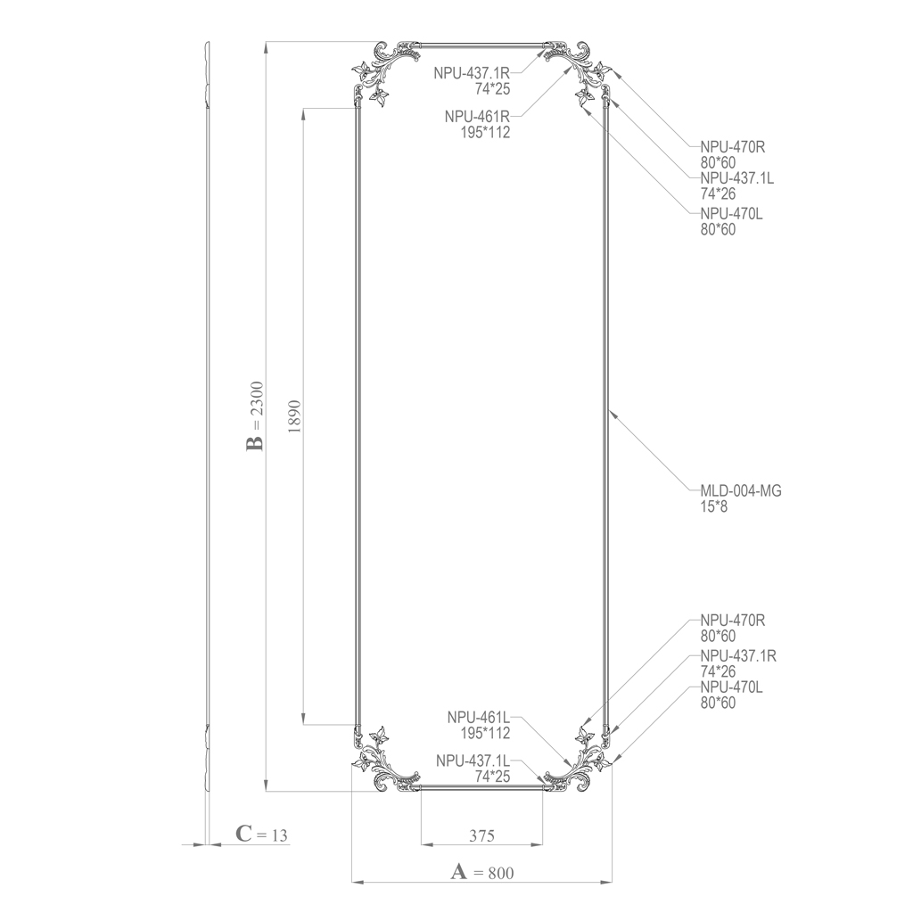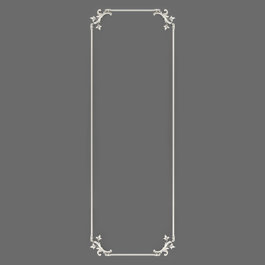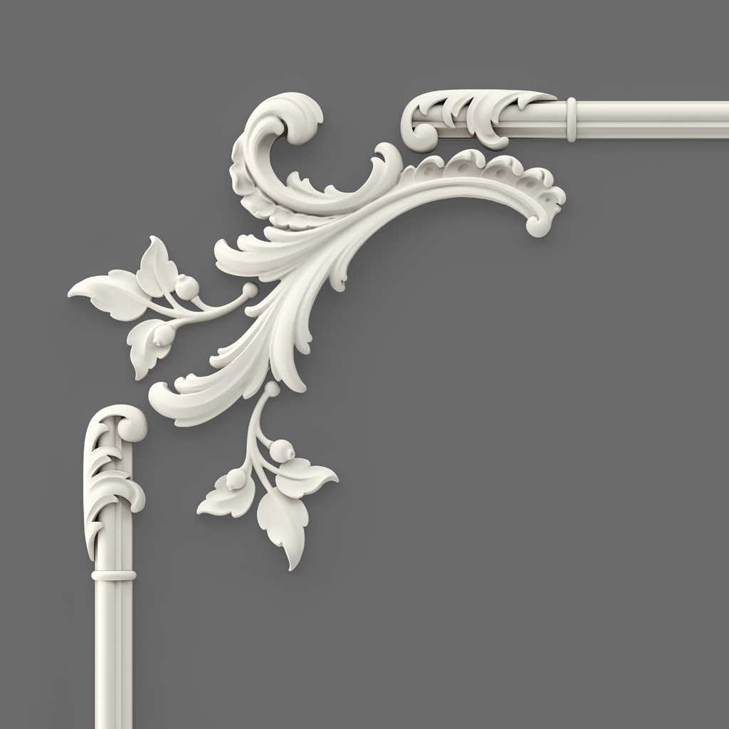 В широкоформатной системе CPU-8-3 угловые акценты на пересечениях молдинга NPU-437.1L/R приобретают повышенную декоративную значимость по сравнению с узкими форматами: при более широком поле и соответственно более длинных горизонтальных отрезках молдинга четыре угловых узла воспринимаются как более протяжённо разнесённые точки, и каждая из них требует более выразительного декоративного оформления. Этим объясняется тот факт, что в широкоформатных системах угловые акценты имеют большее относительное значение, чем в узких: они «собирают» широкую рамку в единую систему, визуально связывая четыре дальних угла декоративного поля.