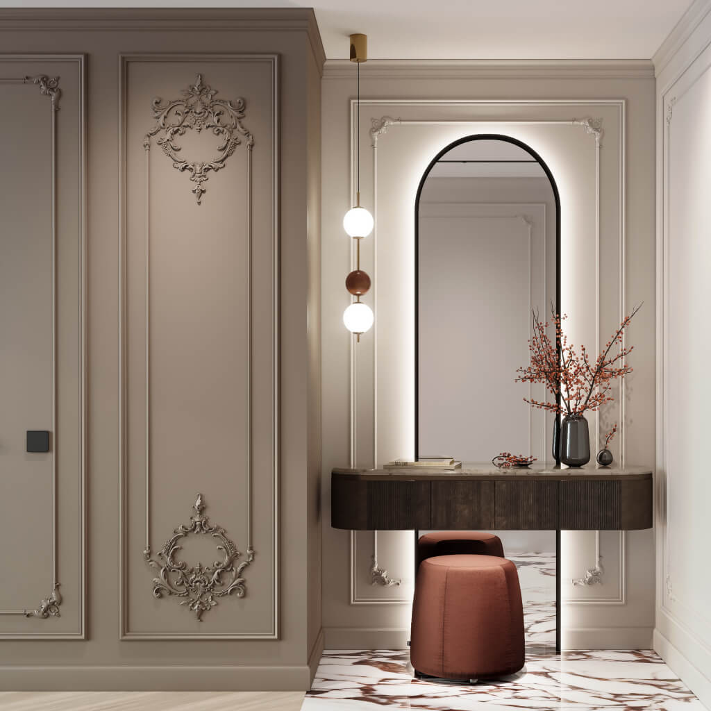 Прихожая — единственное пространство, которое видят все без исключения гости. И единственное, которому чаще всего уделяется наименьшее внимание при декорировании. Лепной декор для прихожей из комплекта CPU-7-1 исправляет эту несправедливость: одна вертикальная панель на боковой стене прихожей мгновенно поднимает статус всего интерьера — ещё в момент, когда гость переступает порог.