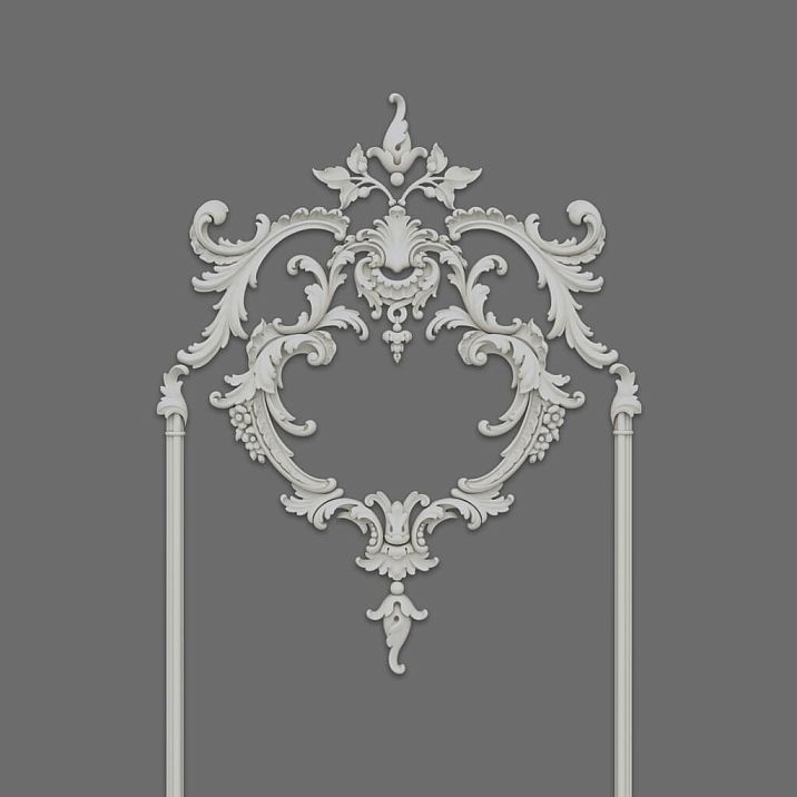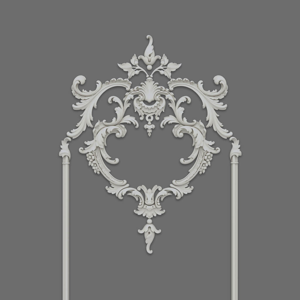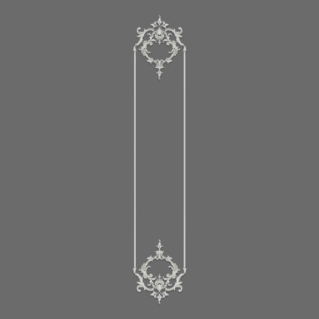 CPU-7-1 — это насыщенная, парадная, выразительно декоративная композиция. Не лаконичный молдинговый контур, не минималистичная рамка в скандинавском духе. Это именно то, что можно назвать «архитектурным декором в полный рост»: молдинг задаёт строгий геометрический периметр, а внутри этого периметра разворачивается растительный орнамент — угловые акценты с листьями и завитками, центральные медальоны с развёрнутым цветочным рисунком, боковые вставки, горизонтальные завершения.