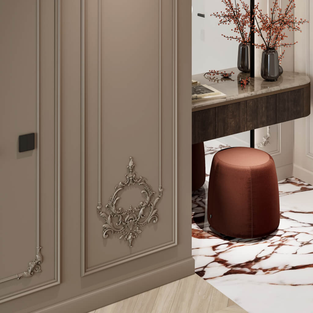 Современная классика отличается от неоклассики прежде всего масштабом высказывания: тот же словарь, но произносится тише, деликатнее. Комплект лепнины для стен CPU-7-1 в цвет стены (без контрастного выделения) работает в современной классике именно так: декор чувствуется, но не декларируется. Рельеф проявляется только при боковом свете — и это именно тот эффект, который называют «архитектурной тенью».
