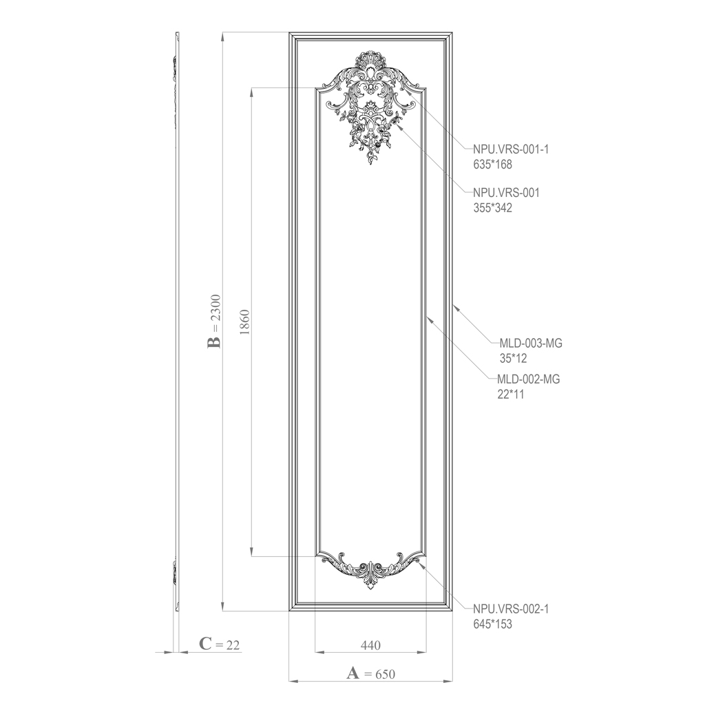 Лепной декор NPU.VRS-001-1 размером 635 × 168 × 22 мм является верхним горизонтальным орнаментальным поясом системы и занимает ключевую позицию в структуре панели — её верхнюю треть, которая при восприятии интерьера фиксируется взглядом первой. Ширина 635 мм точно соответствует внутреннему просвету рамки шириной 650 мм с учётом профиля молдингов — изделие устанавливается вплотную к внутренним граням молдингов и полностью заполняет горизонтальный пояс без зазоров и выступов. Высота 168 мм создаёт орнаментальную полосу, достаточно широкую для размещения развитого горизонтального орнамента, но не настолько высокую, чтобы визуально перегружать верхнюю зону панели. Глубина рельефа 22 мм является максимальной в системе — именно горизонтальные пояса несут наибольшую орнаментальную нагрузку и потому требуют наиболее выразительного, объёмного рельефа. Орнаментальный язык этого декора принадлежит традиции французского барокко и рококо: горизонтально развёрнутая арабеска с симметрично расходящимися побегами, акантовыми листьями, цветочными мотивами и завитками создаёт насыщенную декоративную полосу, в которой природные формы подчинены строгой орнаментальной логике. Рельеф верхнего пояса при боковом освещении отбрасывает богатые тени, которые делают поверхность живой и динамичной — это особенно важно в верхней зоне панели, куда направлены естественный свет из окон и свет потолочных светильников.