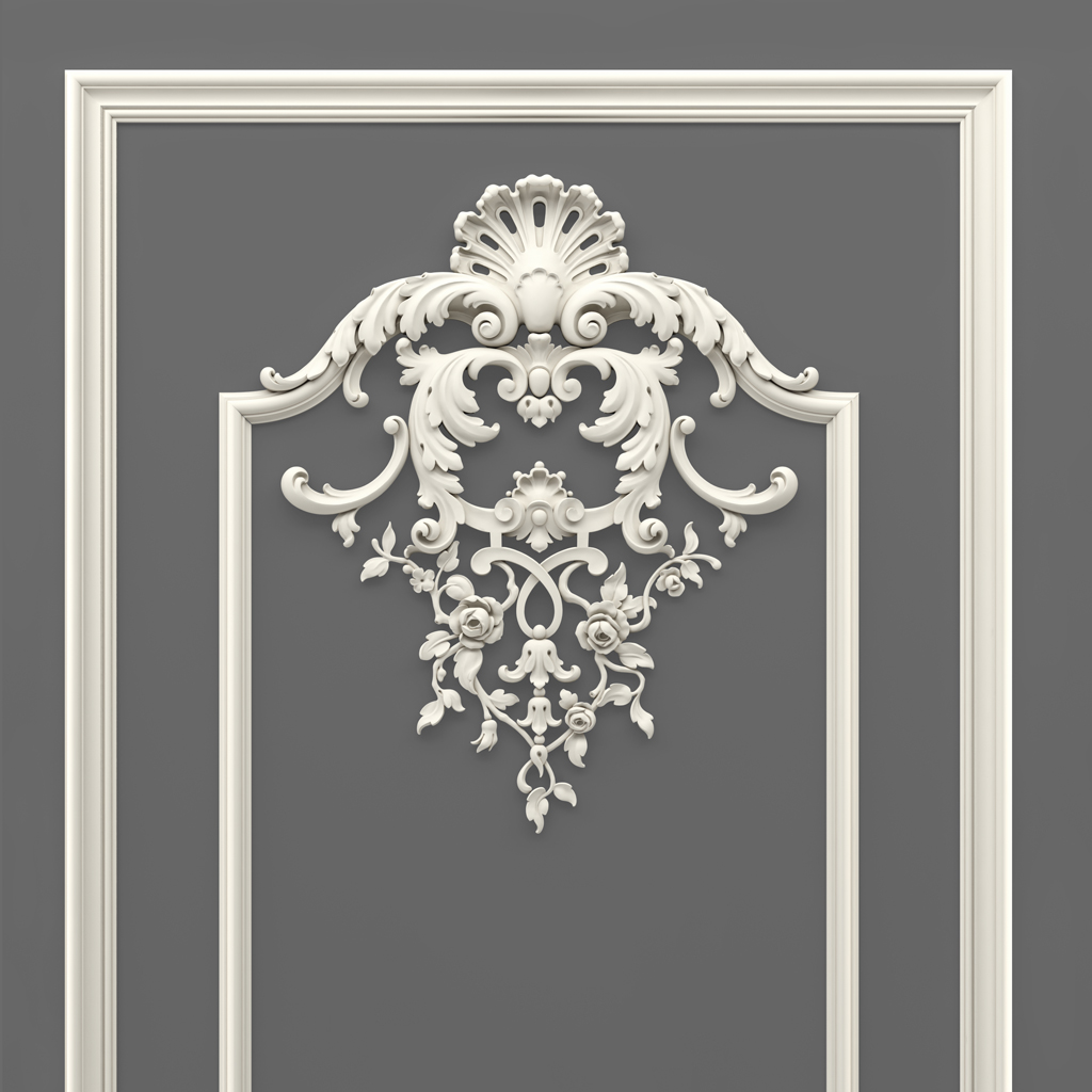 Лепной декор NPU.VRS-001 размером 355 × 342 × 17 мм является центральным орнаментальным элементом системы CPU-5-2 и несёт в себе главную смысловую нагрузку всей панели. Размеры 355 × 342 мм создают почти квадратную пропорцию — характерную для центральных розеток и медальонов классической буазери, которые традиционно располагаются в геометрическом центре внутреннего поля панели и создают точку максимальной орнаментальной концентрации. Этот декоративный элемент является самостоятельной художественной единицей: его орнаментальная программа разворачивается центробежно — из центральной точки во все стороны, создавая симметричную, уравновешенную композицию с ясной структурой и богатым содержанием. Акантовые листья, завитки, цветочные мотивы, раковинные элементы — весь словарь барочно-рокайльной пластики представлен здесь в полном объёме и с высоким качеством скульптурной проработки. Глубина рельефа 17 мм несколько меньше, чем у горизонтальных поясов — это также намеренное решение: центральный медальон должен быть главным по смыслу, но не обязан быть самым объёмным по рельефу, поскольку его доминирование достигается расположением в центре и масштабом орнаментального содержания, а не глубиной выступа. При взгляде на смонтированную панель центральный декор немедленно притягивает внимание — именно к нему движется взгляд, пройдя по контуру рамки через горизонтальные пояса, и именно он остаётся в памяти как визуальный образ всей стеновой секции.