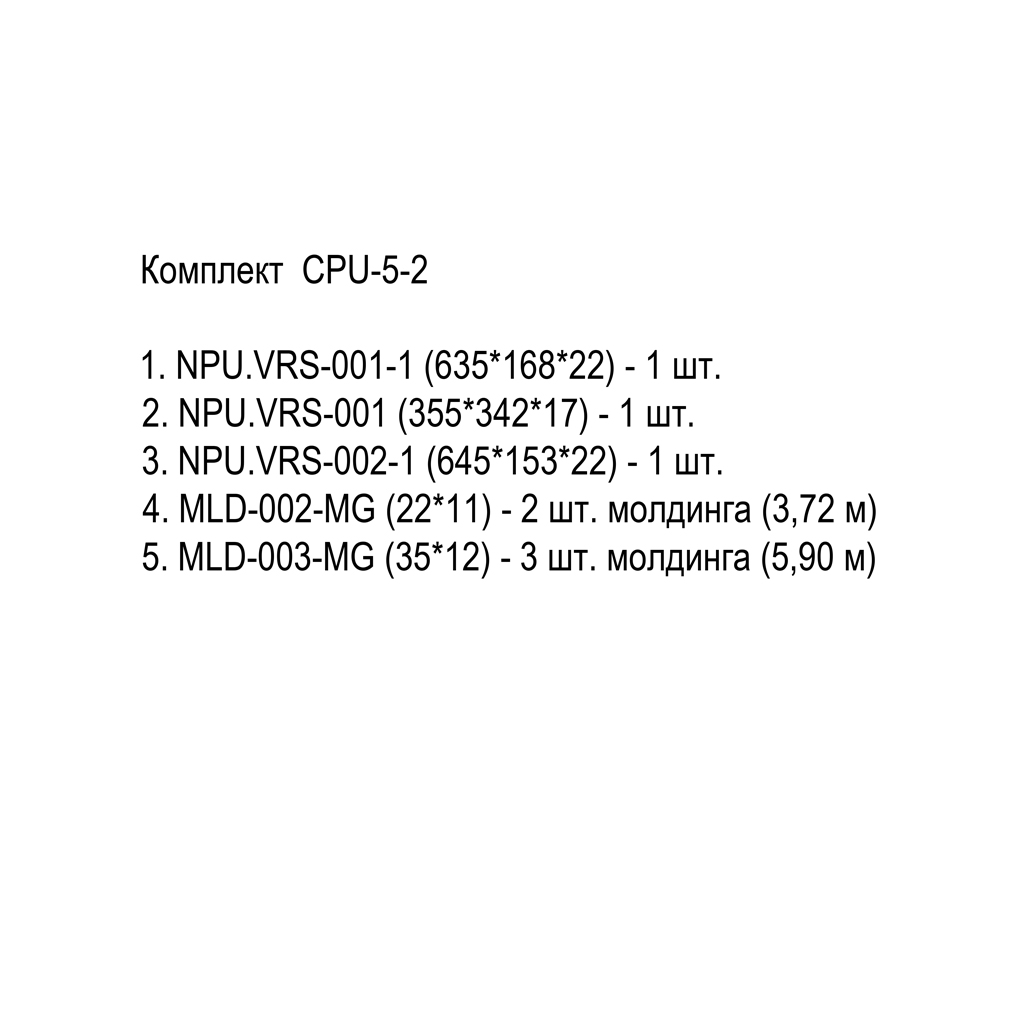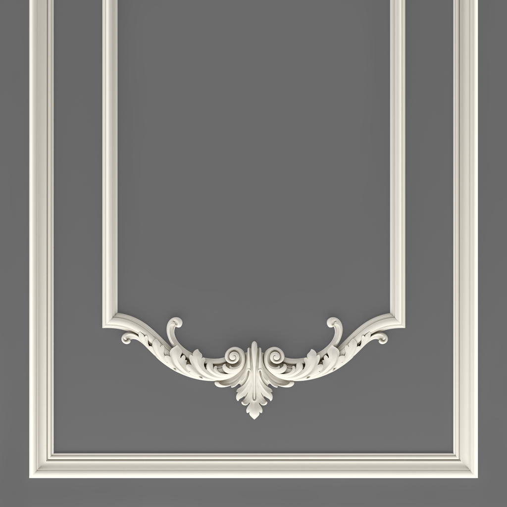 Понимание логики комплекта CPU-5-2 начинается с осознания того, как именно пять входящих в него элементов взаимодействуют между собой внутри единой декоративной системы. Внешний молдинг MLD-003-MG с профилем 35 × 12 мм формирует основной видимый контур всей панели — это её архитектурный «скелет», задающий геометрические границы и масштаб. Внутренний молдинг MLD-002-MG с профилем 22 × 11 мм создаёт второй, более тонкий контурный обвод, параллельный внешнему и отступающий от него на небольшое расстояние — классический приём двойного молдинга, который добавляет панели глубину и многослойность. Лепной декор NPU.VRS-001-1 размером 635 × 168 × 22 мм является верхним горизонтальным орнаментальным поясом — он устанавливается в верхней части панели между молдингами и разделяет её внутреннее пространство на зоны, добавляя орнаментальную насыщенность в области, которую взгляд человека фиксирует прежде всего при входе в помещение. Лепной декор NPU.VRS-002-1 размером 645 × 153 × 22 мм является нижним горизонтальным поясом, зеркально отвечающим верхнему и создающим симметричную раму для центрального орнамента. Наконец, лепной декор NPU.VRS-001 размером 355 × 342 × 17 мм — это центральная розетка или медальон, занимающая внутреннее поле панели между двумя горизонтальными поясами и несущая главную смысловую и декоративную нагрузку всей системы. Именно такая пятичастная структура — внешняя рамка, внутренний обвод, верхний пояс, нижний пояс и центральный акцент — воспроизводит каноническую схему французской буазери с наибольшей архитектурной полнотой.