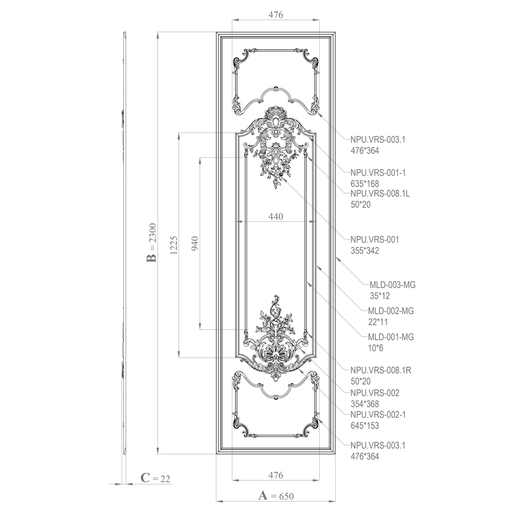 Архитектурная логика комплекта CPU-5-5 строится на чёткой иерархии десяти компонентных позиций, которые взаимодействуют в единой системе на нескольких орнаментальных уровнях одновременно. Первый уровень — несущий рамочный каркас из трёх типов молдингов: внешний МДФ-молдинг MLD-003-MG с профилем 35 × 12 мм суммарной длиной 5,90 мм (три единицы) формирует главный архитектурный контур; средний молдинг MLD-002-MG с профилем 22 × 11 мм суммарной длиной 2,45 мм (одна единица) создаёт внутренний параллельный обвод; ультратонкий молдинг MLD-001-MG с профилем 10 × 6 мм суммарной длиной 1,88 мм (одна единица) формирует третий деликатный контур в зоне центрального орнаментального поля. Второй уровень — горизонтальные орнаментальные пояса: верхний NPU.VRS-001-1 размером 635 × 168 × 22 мм и нижний NPU.VRS-002-1 размером 645 × 153 × 22 мм структурируют вертикальное пространство внутри рамки и создают верхнюю и нижнюю границы центрального орнаментального поля. Третий уровень — двойная рамочная система: две идентичных накладки NPU.VRS-003.1 размером 476 × 364 × 16 мм, размещённые вертикально одна над другой в центральном поле, создают две орнаментальных ниши — архитектурный приём, не встречающийся ни в одном другом комплекте серии. Четвёртый уровень — центральные медальоны: NPU.VRS-001 размером 355 × 342 × 17 мм располагается внутри верхней рамочной накладки NPU.VRS-003.1, NPU.VRS-002 размером 354 × 368 × 19 мм — внутри нижней. Пятый уровень — микроугловые акценты: четыре элемента NPU.VRS-008.1L и NPU.VRS-008.1R размером 50 × 20 × 9 мм (по два каждого) детализируют угловые узлы внутренних молдингов. Такая пятиуровневая структура является наиболее глубокой и многослойной в серии и именно она обеспечивает CPU-5-5 тот особый характер орнаментальной насыщенности, который при взгляде на готовую панель воспринимается как нечто качественно иное по сравнению с любой однорамочной системой.