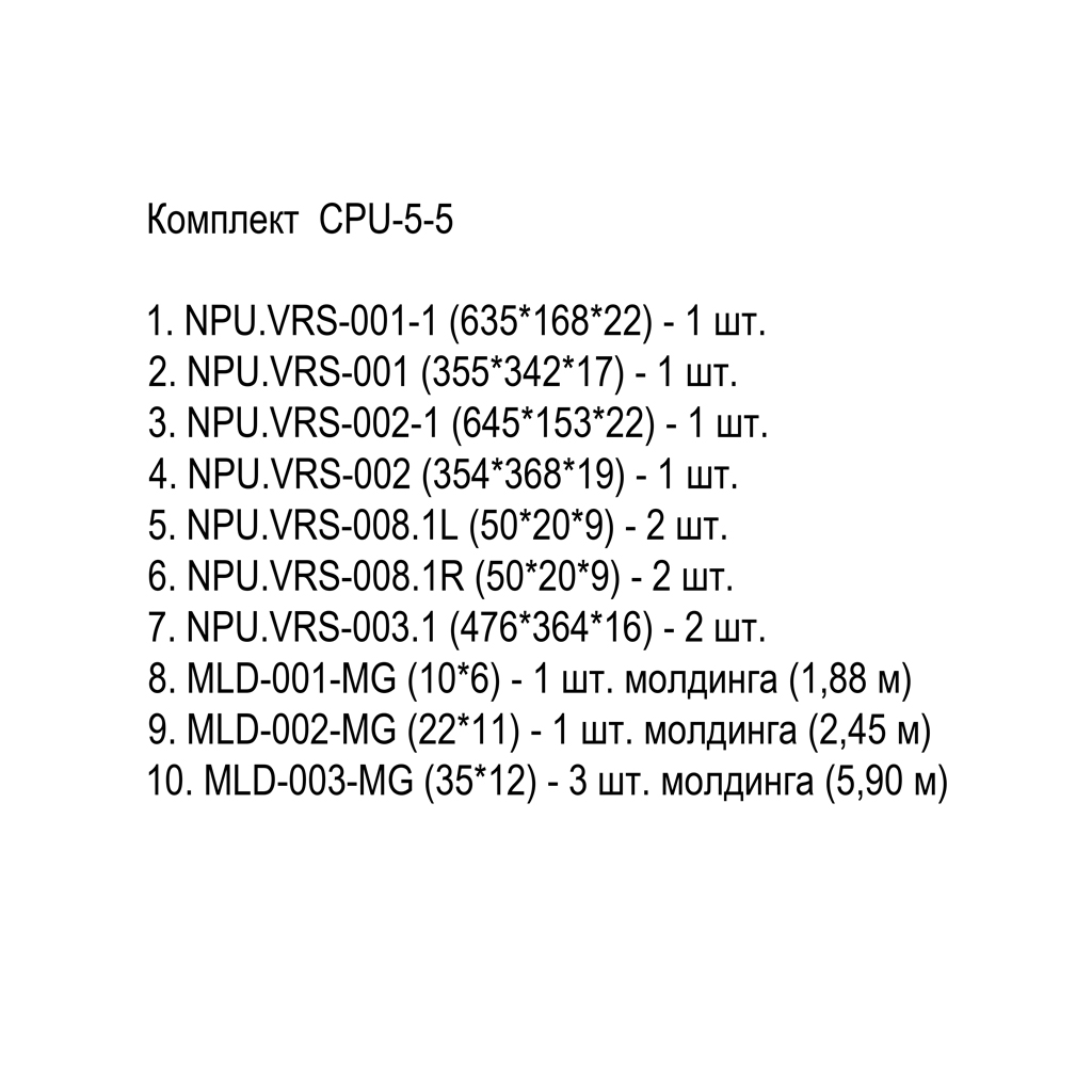Комплект CPU-5-5 создаёт вертикальную стеновую панель с габаритными размерами 650 × 2300 мм и максимальной глубиной рельефа 22 мм — горизонтальные пояса NPU.VRS-001-1 и NPU.VRS-002-1. Полный компонентный состав по позициям: NPU.VRS-001-1 размером 635 × 168 × 22 мм — 1 шт., полиуретан грунтованный; NPU.VRS-001 размером 355 × 342 × 17 мм — 1 шт., полиуретан грунтованный; NPU.VRS-002-1 размером 645 × 153 × 22 мм — 1 шт., полиуретан грунтованный; NPU.VRS-002 размером 354 × 368 × 19 мм — 1 шт., полиуретан грунтованный; NPU.VRS-008.1L размером 50 × 20 × 9 мм — 2 шт., полиуретан грунтованный; NPU.VRS-008.1R размером 50 × 20 × 9 мм — 2 шт., полиуретан грунтованный; NPU.VRS-003.1 размером 476 × 364 × 16 мм — 2 шт., полиуретан грунтованный; MLD-001-MG с профилем 10 × 6 мм — 1 единица молдинга (1,88 м), МДФ грунтованный; MLD-002-MG с профилем 22 × 11 мм — 1 единица молдинга (2,45 м), МДФ грунтованный; MLD-003-MG с профилем 35 × 12 мм — 3 единицы молдинга (5,90 м), МДФ грунтованный. Суммарная длина молдингов трёх типов составляет 10,23 мм. Всего в комплекте 14 штучных изделий (включая молдинги как отрезки) по десяти номенклатурным позициям. Все изделия поставляются с заводской белой акриловой грунтовкой. Совместимые финишные покрытия: все виды водоэмульсионных красок, алкидные эмали, нитроэмали, декоративные лессировки, патинирующие составы на водной и масляной основе.