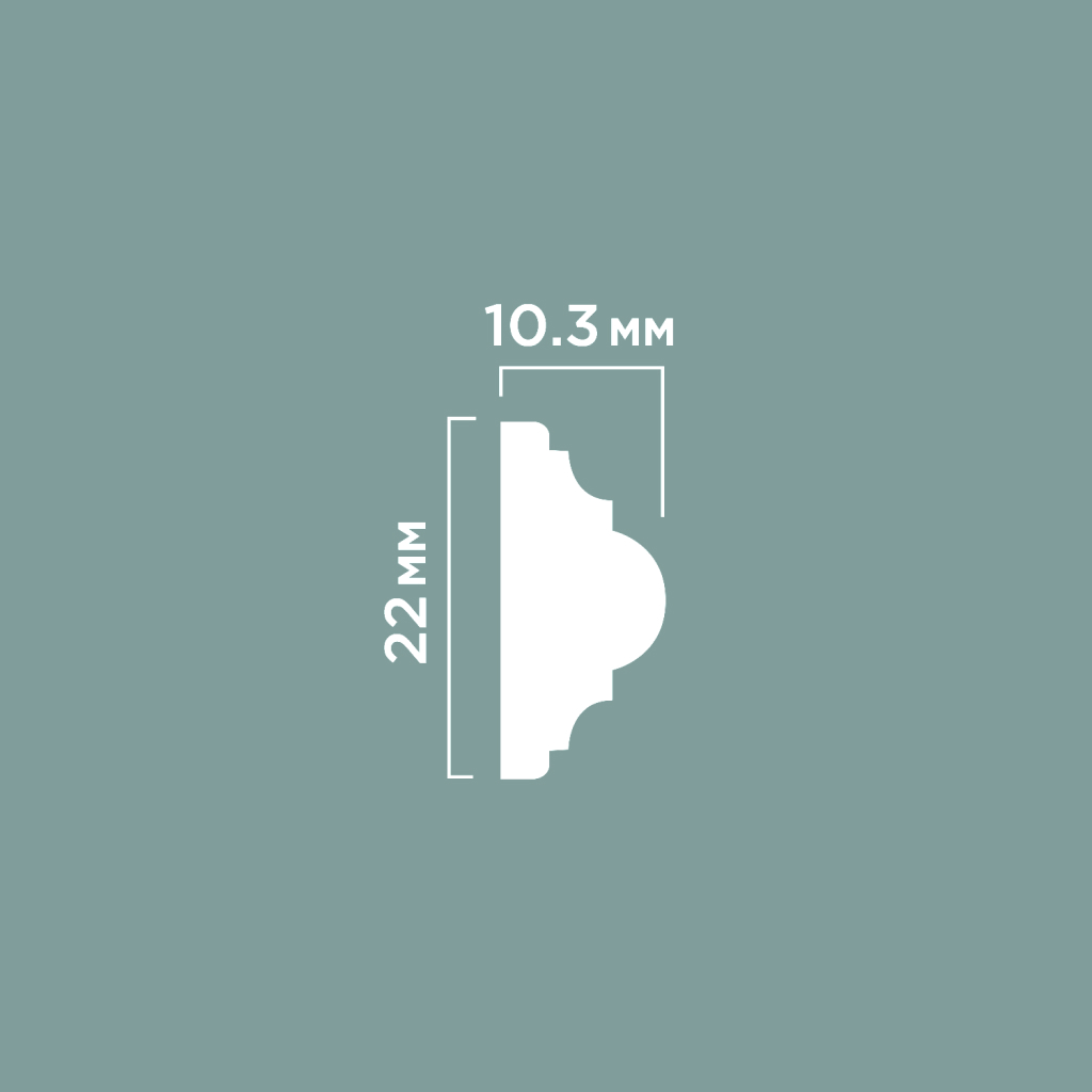 Высота профиля 10,3 миллиметра создает достаточный объем для формирования выразительной игры света и тени на поверхности. Профиль D22V1 имеет характерную фигурную форму с тремя параллельными желобками различной глубины, что придает молдингу классическую архитектурную выразительность. Такая геометрия профиля традиционно используется в классических и неоклассических интерьерах для создания эффекта дорогой архитектурной лепнины.