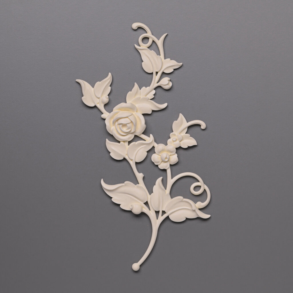По фото видно, что лепной декор CPU-047 представляет собой масштабную композицию в стиле барокко. В центре расположена изящная арка с завитками и цветочными мотивами, напоминающая ажурный портал. Слева и справа композицию дополняют крылатые фигуры, придающие декору лёгкость и динамику. Обратите внимание на детально проработанные листья, завитки и цветы: каждый элемент выполнен аккуратно, что делает декор похожим на настоящую резьбу по камню или дереву.