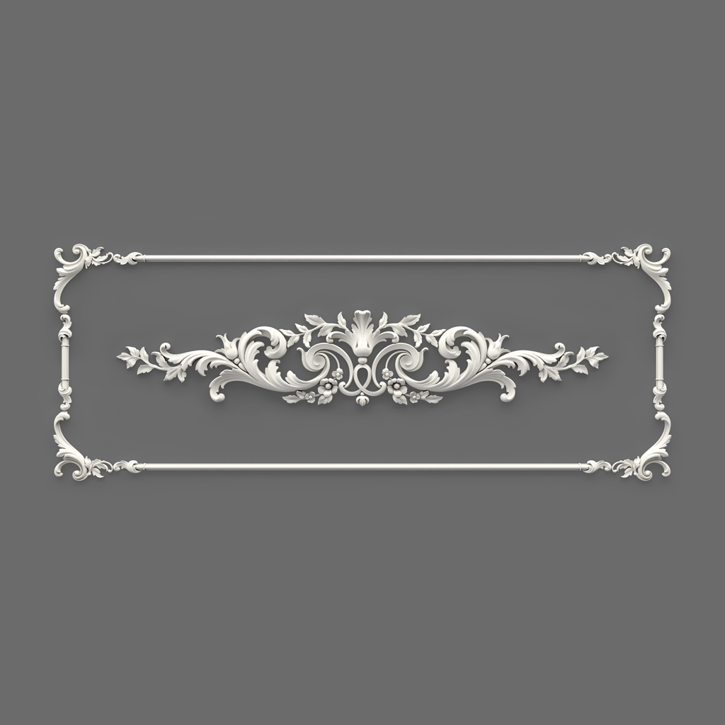 Центральный орнамент панно CPU.VRS-064.1 разворачивается в характерной для французского рококо горизонтальной арабеске с осевой симметрией и нарастающей от краёв к центру плотностью рельефа. Структура орнамента строится по принципу, хорошо знакомому любому, кто изучал декоративные программы европейских дворцов: от центрального смыслового ядра в обе стороны расходятся ветвящиеся побеги с листьями, цветами и завитками, постепенно теряя плотность к краям и уступая место рамочным элементам. Центральный мотив — традиционная для барокко и рококо пальметта или раковина с вертикальными рёбрами — венчает всю композицию и служит её визуальной осью, относительно которой симметрично разворачивается всё остальное орнаментальное пространство. Из центрального узла вырастают крупные листья аканта с характерной для рококо мягкой, почти живой пластикой — они не вписаны в жёсткую геометрическую схему, а как бы сами выбирают направление роста, закручиваясь спиралями, разворачиваясь в объёме и вступая в диалог с соседними элементами. Цветочные гирлянды и отдельные цветочные головки — розы, бутоны, соцветия с лепестками разной степени раскрытости — вплетены в орнамент с той точностью, которая характерна именно для зрелого рококо: не как декоративный трафарет, а как имитация живой природы, схваченной в момент максимального расцвета. Вьющиеся побеги заполняют пространство между крупными элементами, связывая их в единую орнаментальную ткань без пустот и разрывов. По периметру орнамент вписан в рамочный контур, образованный молдингом с тонким профилем — он фиксирует границы панно и создаёт чёткий архитектурный силуэт, без которого даже самый богатый орнамент воспринимался бы как хаотичное нагромождение деталей. Угловые узлы рамки решены с помощью фигурных угловых накладок с барочными завитками — они акцентируют переходы горизонтальных и вертикальных линий и добавляют орнаментальную детализацию на пересечении осей. Рельеф максимальной глубиной 18 мм обеспечивает полноценную скульптурную объёмность всей композиции: при боковом освещении каждый листик, каждый завиток, каждый лепесток роскошно живёт в собственной тени.