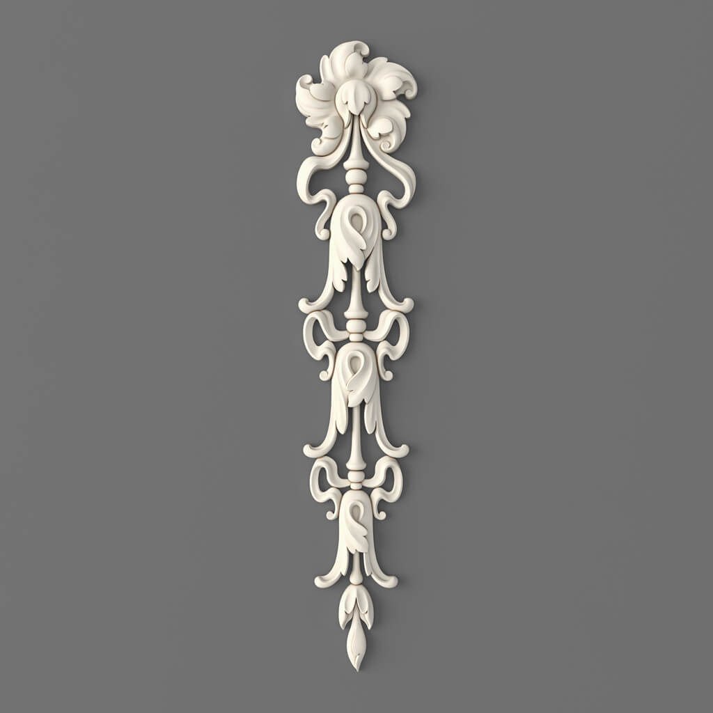 Вертикальный лепной декор NPU-501 с таким орнаментом особенно хорош в контексте, где уже есть другие классические элементы: профилированные молдинги, рамочные раскладки на мебели, фурнитура с орнаментом. Накладка не доминирует — она дополняет, создаёт связность, превращает отдельные детали в единый стилевой высказывание.