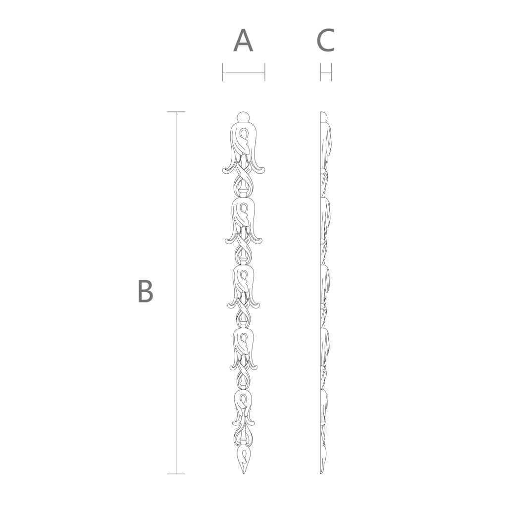 NPU-502 — это изделие, построенное на принципе сдержанной выразительности. Ширина всего 35 мм делает его самым узким форматом в линейке вертикальных накладок STAVROS. Высота 300 мм при такой ширине задаёт пропорцию примерно 1 к 8,5 — вытянутую, стремительную, почти графичную. Это не столько «накладка», сколько орнаментальная линия: вертикальная, ритмичная, классически правильная.
