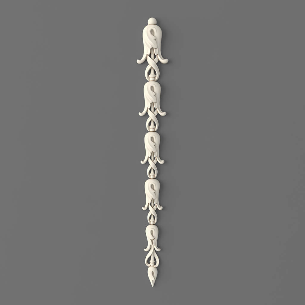 Орнамент NPU-502 построен на принципе повторения. Классический мотив — геометризованный растительный элемент, стилизованный завиток или архитектурный декоративный такт — повторяется вдоль всей высоты изделия, создавая ровный орнаментальный ритм. Это принципиально иная логика, нежели у накладок с раковиной или трёхчастной композицией. Там орнамент имеет начало, середину и конец. Здесь — непрерывный ритм, который можно продолжить: использовать одно изделие, два, три — и орнаментальная линия масштабируется органично.