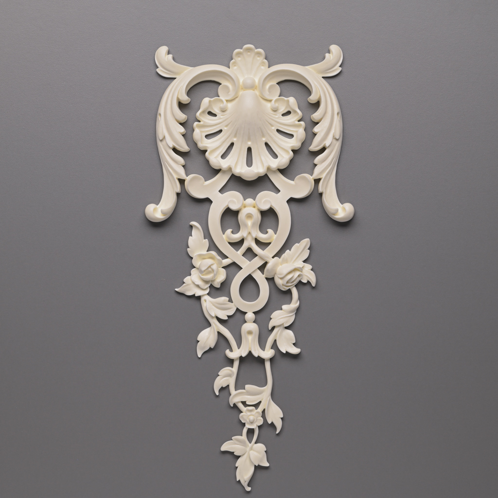 Когда смотришь на фотографию лепного декора NPU.VRS-005, в глаза сразу бросаются несколько ключевых элементов. В верхней части расположена раковина-ракушка, которая часто встречается в барочных и рокайльных композициях, символизируя морскую тематику и плавность линий. Ниже виднеются переплетённые завитки, цветы и листья — словно живой орнамент, спускающийся вниз, как виноградная лоза.