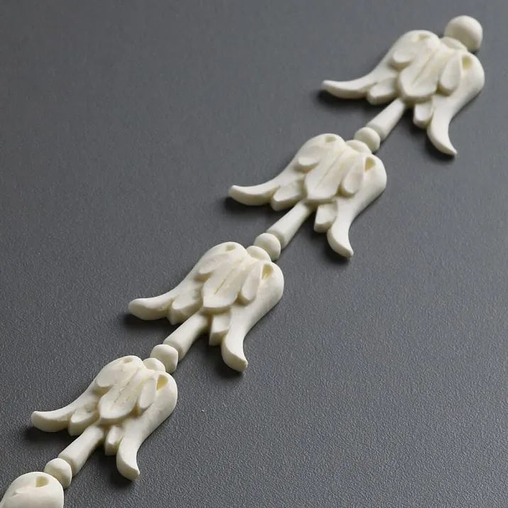 Лепной декор NPU-316 представляет собой удлинённую вертикальную полосу, на которой последовательно расположены небольшие элементы в форме перевёрнутых цветочных бутонов. Каждый бутон имеет плавные, мягкие линии и аккуратно проработанные детали, что создаёт впечатление легкости и утончённости. Расстояние между бутонами незначительно, поэтому вся композиция выглядит целостно и гармонично, напоминая растительную гирлянду или ожерелье из цветов.