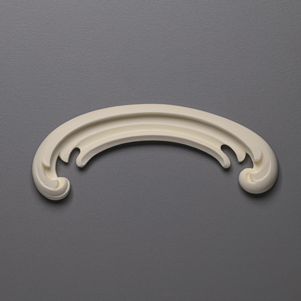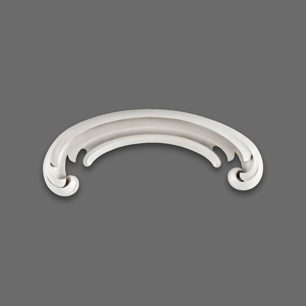 Лепной декор NPU-428 представляет собой дугообразный элемент с несколькими выразительными «волнами» и завитками, которые плавно переходят друг в друга. Такая конструкция напоминает барочные или рокайльные мотивы, но при этом выглядит достаточно лаконично, чтобы вписаться и в более современные стили. Благодаря многослойности формы создаётся впечатление динамики и объёма, что особенно важно при оформлении больших поверхностей.