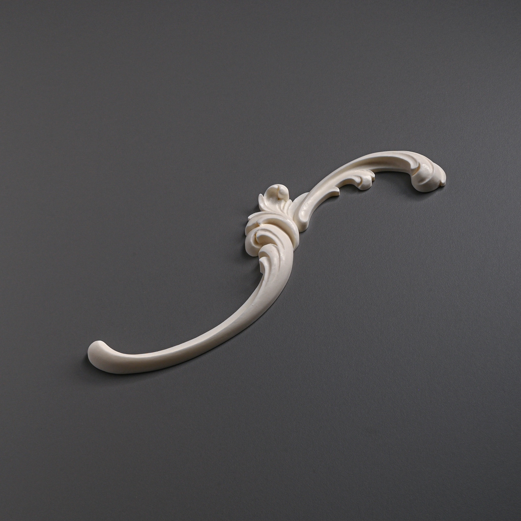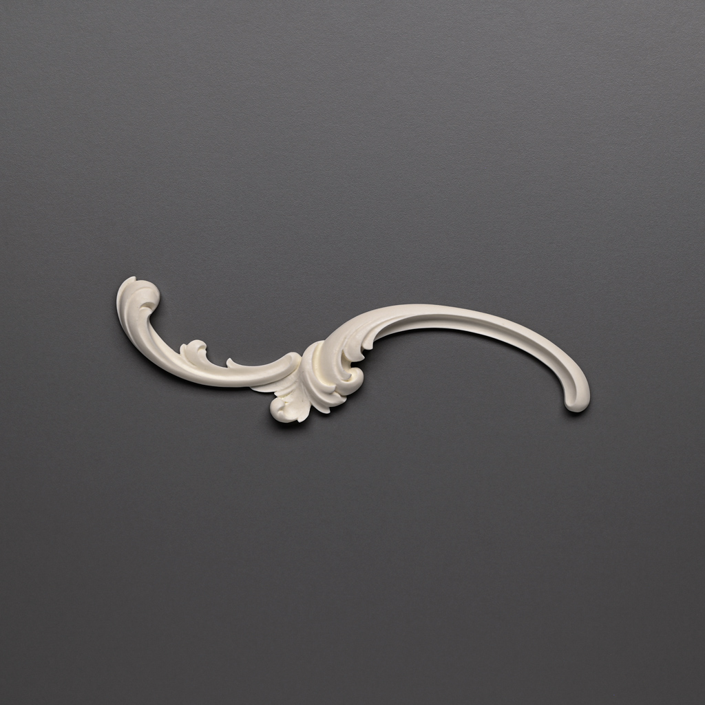 Модель NPU-430L привлекает внимание своими плавными завитками, которые переходят из одной линии в другую, формируя причудливую, но при этом гармоничную композицию. В центре декора заметна более массивная часть, где завитки как бы сходятся, а к краям они утончаются, придавая элементу лёгкость и динамику. Такая форма напоминает растительные мотивы эпохи барокко, что позволяет использовать данный декор в классических и неоклассических интерьерах, а также экспериментировать со стилями.