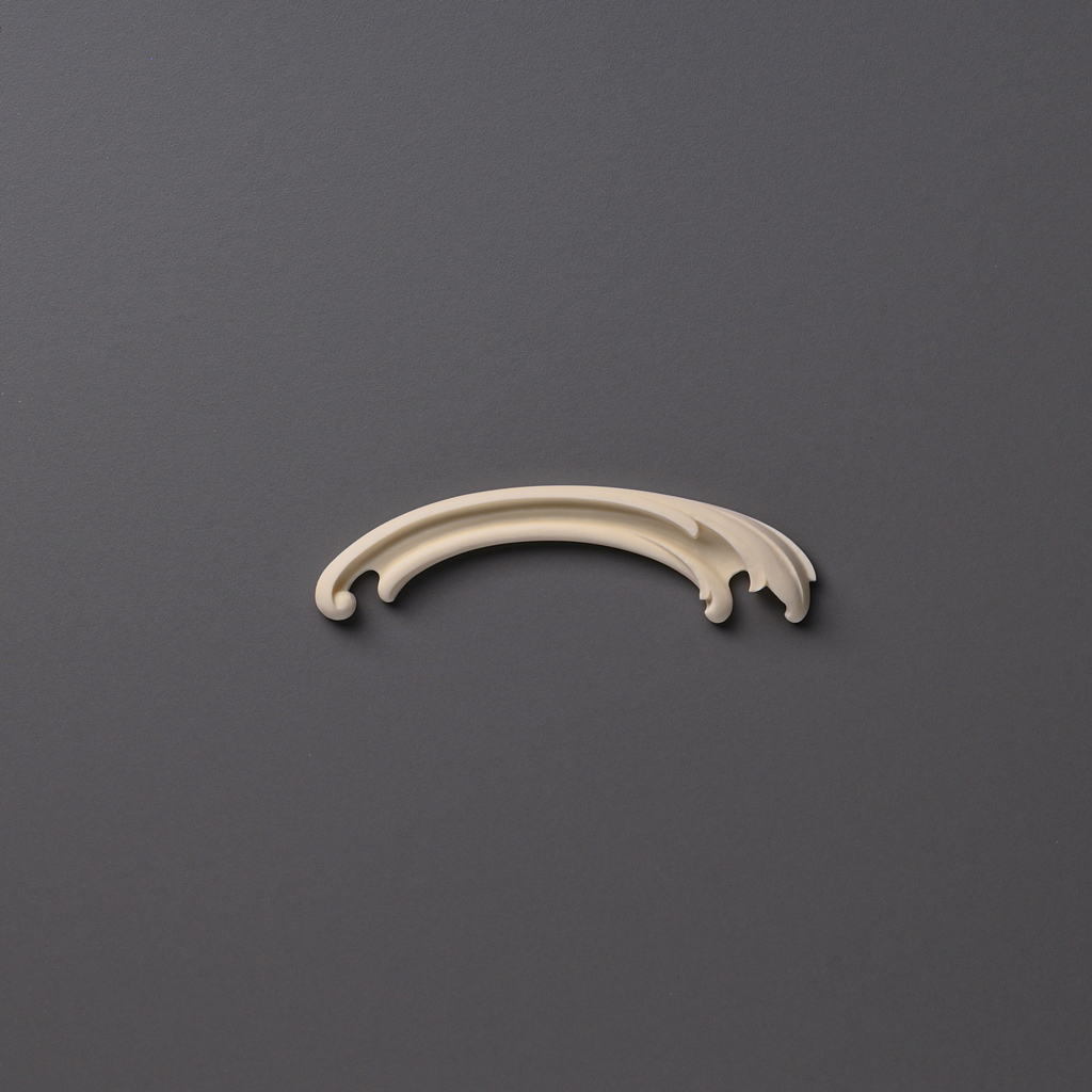 Лепной декор NPU-432R — это изогнутый элемент, который напоминает плавную дугу или волнообразный завиток. При ближайшем рассмотрении заметно, что декор состоит из нескольких ярусов, постепенно уменьшающихся по ширине и завершающихся аккуратными завитками на концах. Такая многоуровневая конструкция создаёт ощущение динамики, словно перед нами не статичный элемент, а застывшее в движении облако или морская волна.