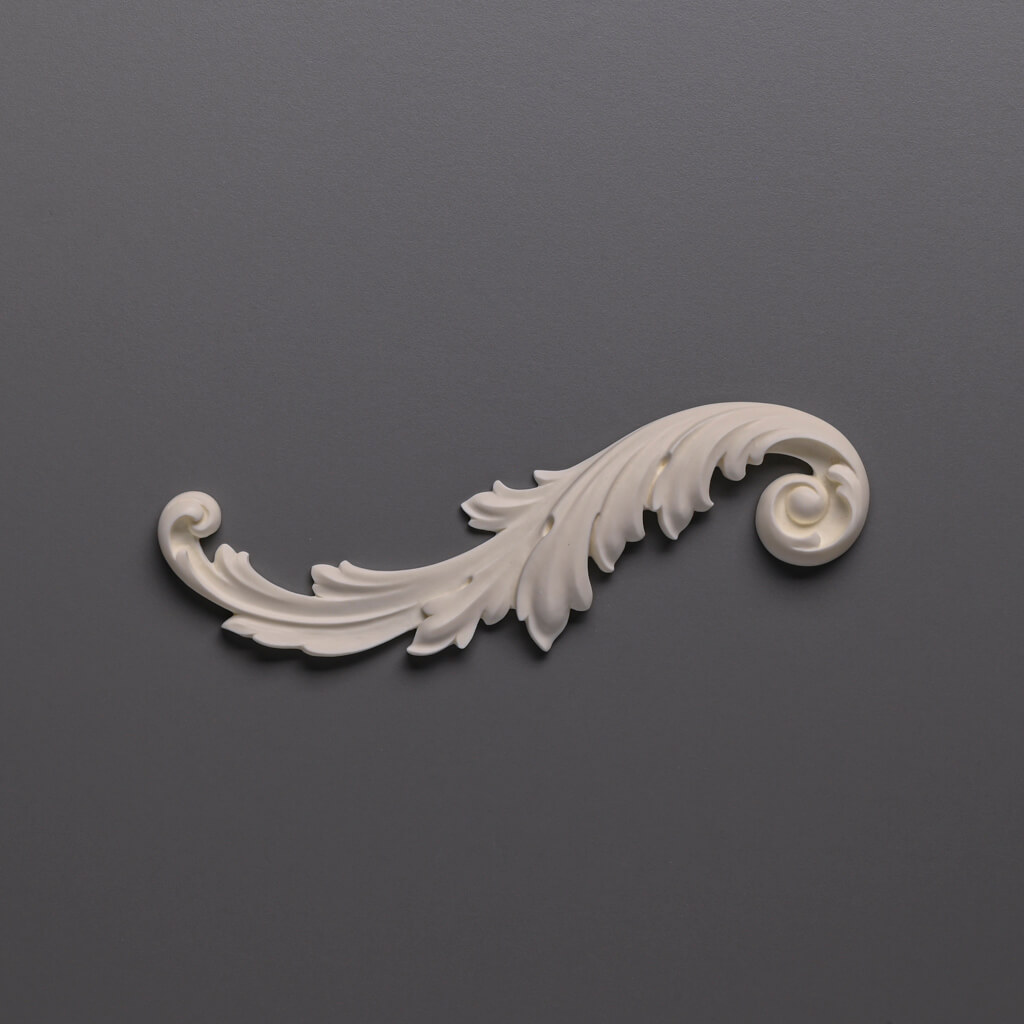 Резная накладка NPU-458L – полиуретан изделия для декора премиального качества с барочным завитком левостороннего исполнения. Декоративный элемент выполнен из высокопрочного влагостойкого полиуретана с детализированным рельефом листовидных мотивов.