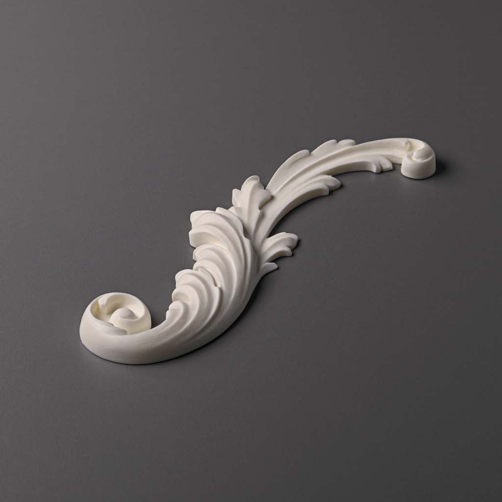На фотографии видно, что лепной декор NPU-458L представляет собой удлинённый завиток, напоминающий барочные орнаменты с листовидными мотивами и спиральными формами. Линии декора плавно перетекают друг в друга, создавая динамичный и при этом гармоничный рисунок. Такая форма выглядит особенно эффектно в сочетании с другими элементами классического или эклектичного дизайна, подчёркивая аристократический характер помещения.
