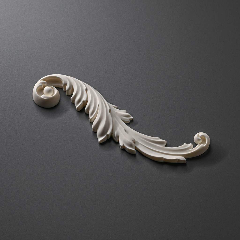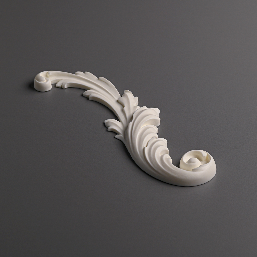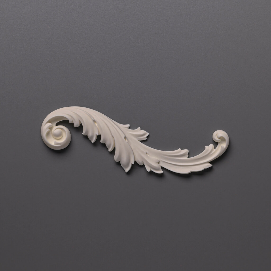 Лепной декор NPU-458R — это элегантная накладка, выполненная в форме вытянутого завитка с листовидными элементами, напоминающими орнаменты эпохи рококо или барокко. Форма декора отличается плавным переходом от одного завитка к другому, а рельеф подчёркнут аккуратными линиями, создающими впечатление воздушности. В верхней части декора можно заметить небольшую спираль, плавно переходящую в лист с закрученным краем, что придаёт модели динамику и изящество.