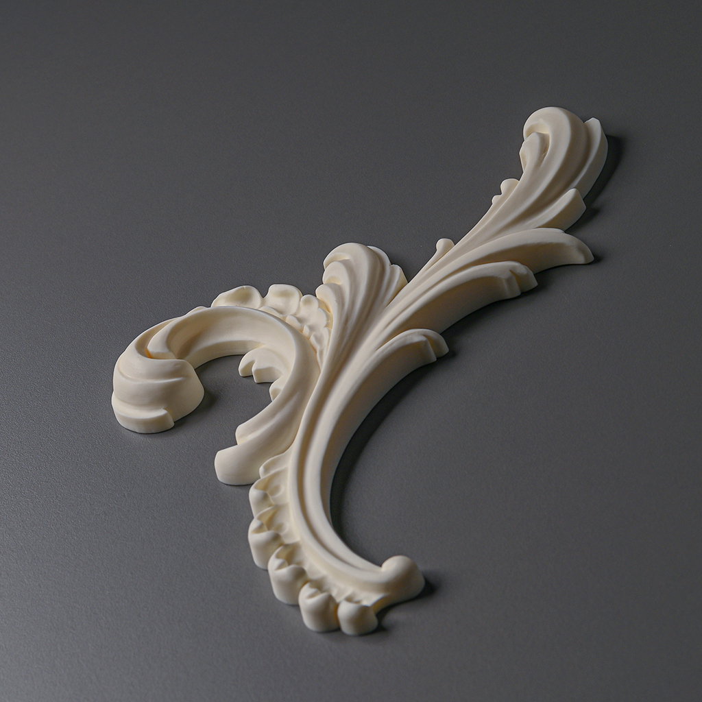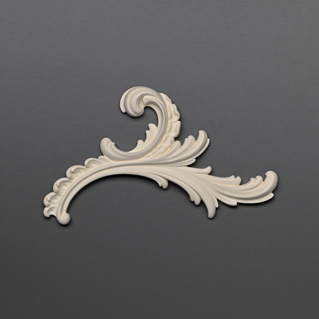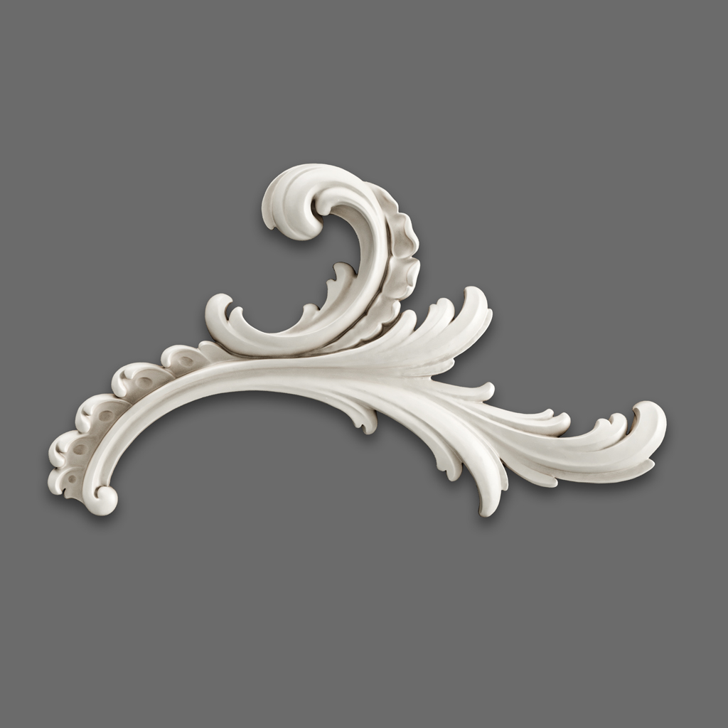Лепной декор NPU-461R внешне напоминает изогнутый акантовый завиток с плавным переходом от одного листа к другому. Внимание привлекает чёткая проработка деталей: края листьев аккуратно завиваются, а внутренние части рельефно подчёркнуты, что придаёт декору глубину и динамику. Благодаря такому дизайну модель хорошо впишется в классические интерьеры, однако и в современном пространстве может стать ярким акцентом, если грамотно выбрать место и способ монтажа.