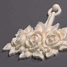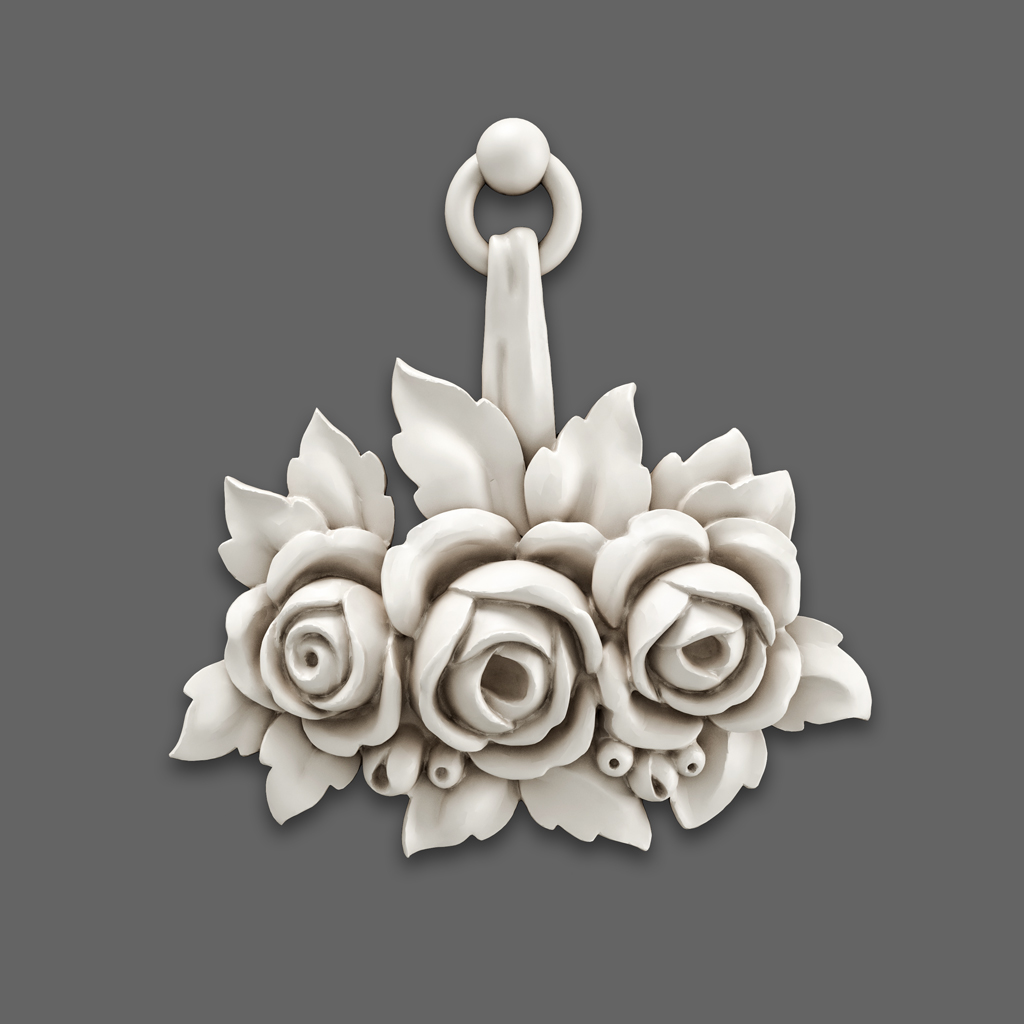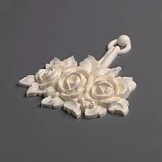 По фотографии видно, что лепной декор NPU-463.2 напоминает роскошный букет, где три объёмные розы расположены в нижней части, окружённые аккуратно проработанными листьями. Сверху композицию венчает миниатюрное кольцо, придающее декору завершённый и изящный вид. Такая форма хорошо впишется как в классические интерьеры, где традиционно ценятся растительные мотивы, так и в более современные пространства, в которых требуется тонкий акцент.