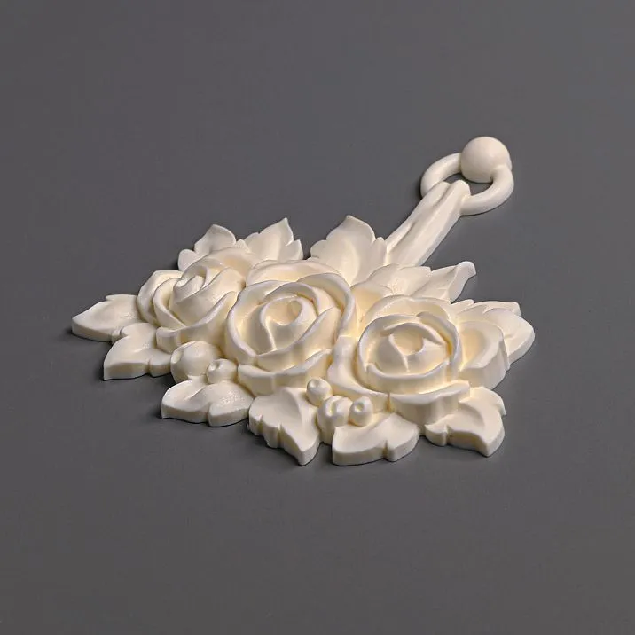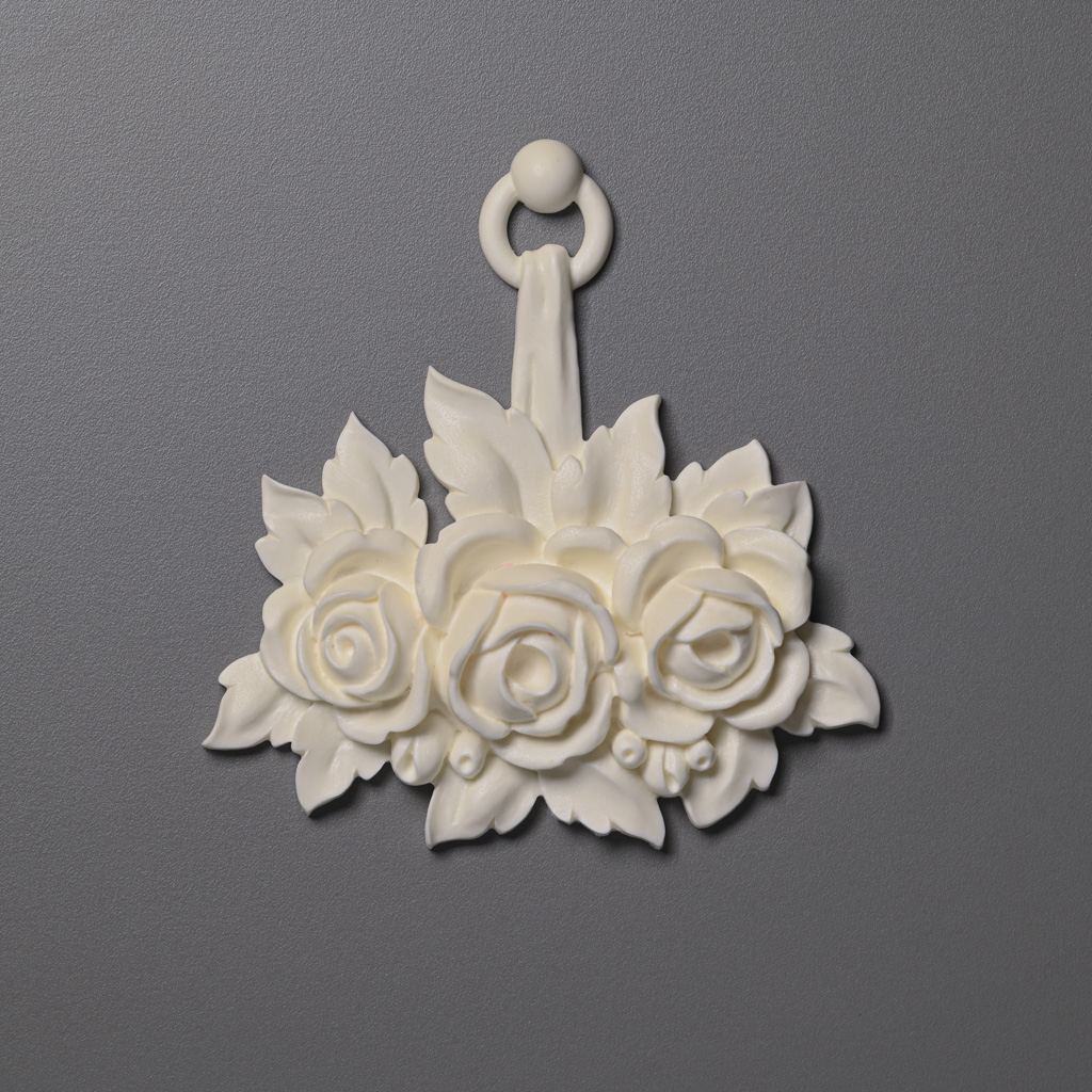 Судя по схематическому чертежу (где обозначены параметры A, B и C), декор имеет продолговатую форму: ширина (A) примерно соответствует габаритам букета, а высота (B) включает в себя пространство над розами и декоративным кольцом. Толщина (C) позволяет добиться выразительного рельефа без чрезмерного выступания. При ближайшем рассмотрении можно заметить, насколько детально проработаны лепестки и листья, что делает композицию реалистичной и добавляет глубины.