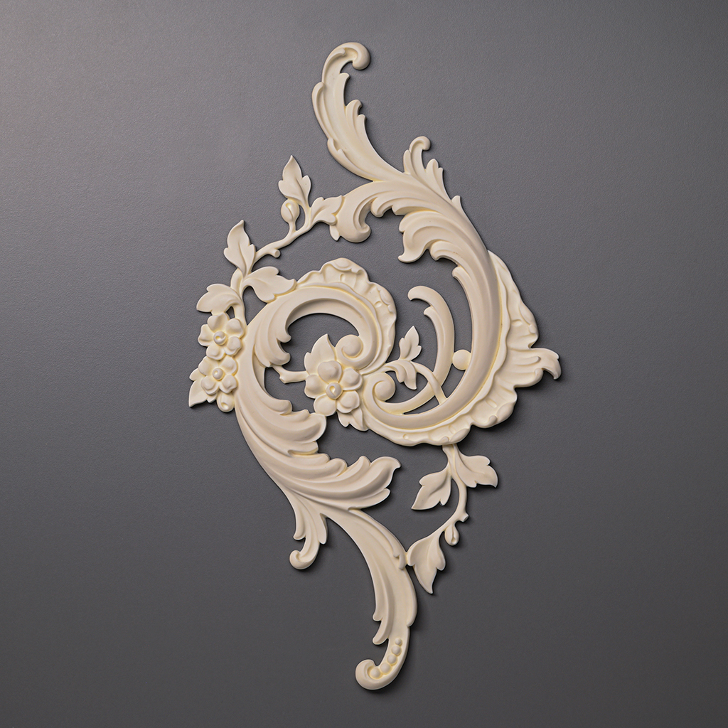 Судя по фото, лепной декор NPU-465 представляет собой утончённую смесь растительных мотивов и аккуратных завитков, которые сплетаются между собой, образуя плавный узор. В центре композиции можно заметить цветочные элементы, обрамлённые листьями, а по краям — завитки, напоминающие классические барочные скроллы. Такая форма придаёт декору лёгкость и динамику, делая его универсальным для самых разных стилей интерьера — от классики до эклектики.