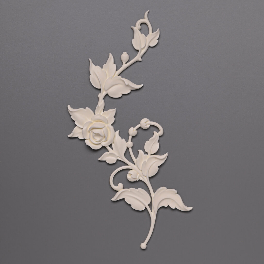 В центре композиции NPU-468R — цветок розы с нежными лепестками и ветвями. Такой декор выглядит выразительно и элегантно, независимо от того, решите ли вы установить его на стене, потолке или фасаде. Роза традиционно ассоциируется с красотой и роскошью, а плавные изгибы листьев и стеблей дополняют общее впечатление лёгкости.