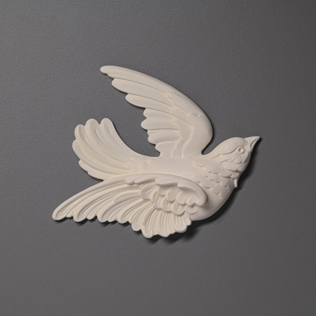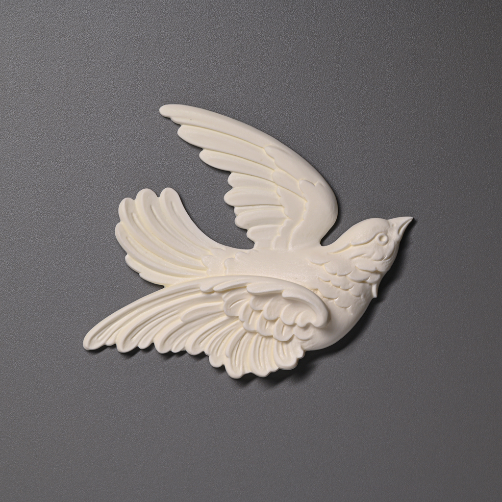 Лепной декор NPU-476L – это птичка с расправленными крыльями, которая словно парит в воздухе. Такой образ символизирует свободу, лёгкость и стремление к новым горизонтам. В интерьере подобная деталь будет ассоциироваться с вдохновением и романтикой, особенно если сочетать её с другими природными мотивами: цветочными орнаментами, ветками или листьями.