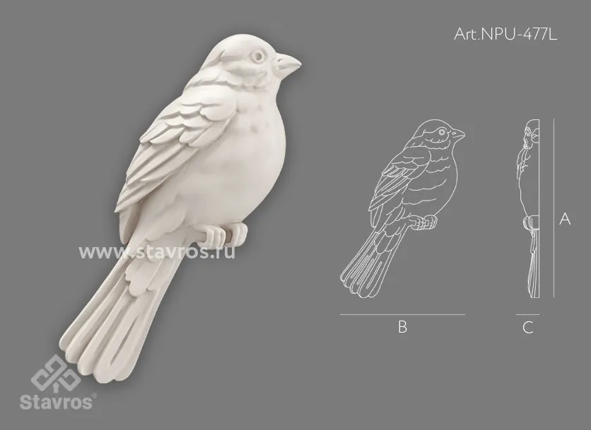 Лепной декор NPU-477L – это уникальный элемент, который воплощает в себе мотив птички в изящном и детализированном исполнении. Если вы посмотрите на фотографии, то заметите, насколько реалистично проработаны перья, голова и хвост. Кажется, что птичка вот-вот оживёт и наполнит комнату атмосферой лёгкости и безмятежности. Такой лепной декор отлично подойдёт для тех, кто стремится привнести в интерьер природные мотивы, при этом не перегружая пространство громоздкими деталями.