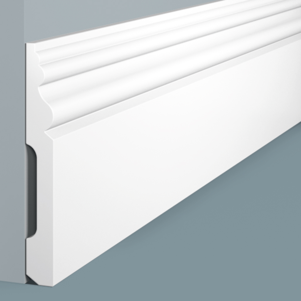 Экстремальный плинтус B126 высотой 126 мм с гладкой минималистичной поверхностью находит применение в самых грандиозных и престижных интерьерных проектах. В элитных загородных резиденциях, особняках и дворцах с высотой потолков 4-6 метров этот плинтус полистирольный создает грандиозное монументальное обрамление просторных парадных холлов площадью 200-400 м², представительских гостиных колоссальных размеров, парадных столовых, библиотек с многоярусными стеллажами и главных спален, максимально подчеркивая масштабность и величие.