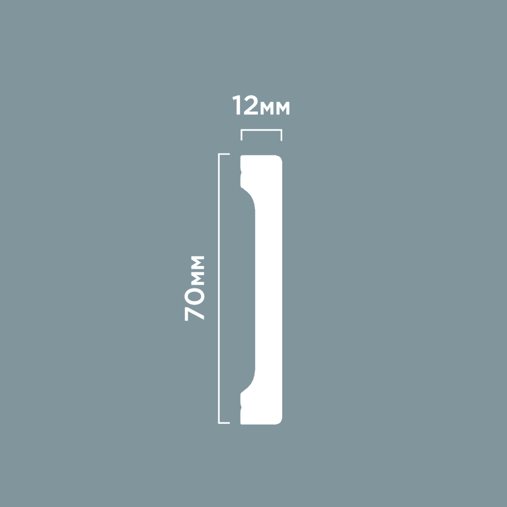 Толщина 12 мм представляет собой оптимальное значение, которое обеспечивает достаточную жесткость конструкции для профиля высотой 70 мм без излишней массивности. Такая толщина создает надежную монтажную площадку для нанесения клея для полистирольных плинтусов и гарантирует, что профиль не прогнется при установке даже на стены с небольшими неровностями до 2-3 мм. При этом плинтус сохраняет элегантность линий, не выглядит громоздким и не создает препятствий для установки мебели вплотную к стенам. Стандартная длина планки 2000 мм позволяет эффективно закрывать периметр стандартного помещения с минимальным количеством стыков и минимальными отходами материала.