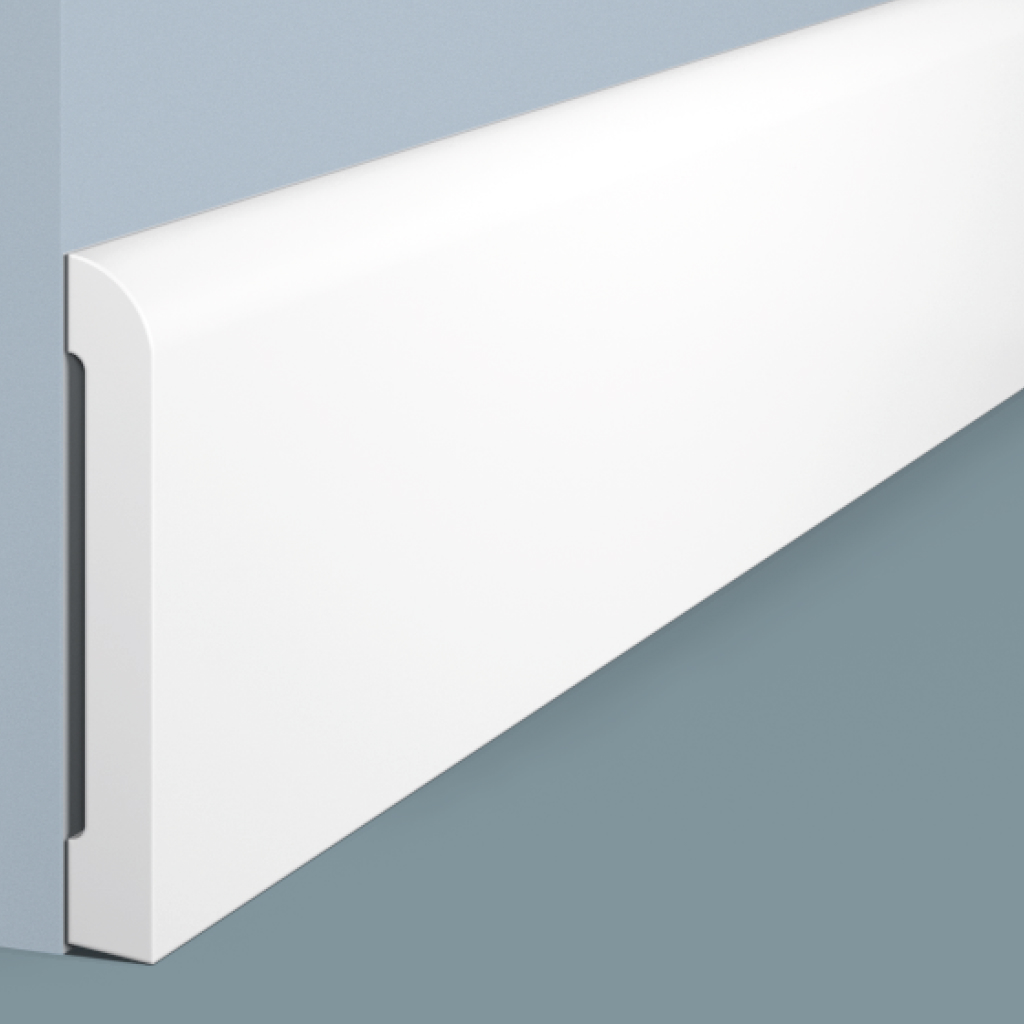 Абсолютная влагостойкость 100% делает плинтус для пола полистирольный универсальным для любых помещений. Белая матовая поверхность под покраску открывает безграничные возможности для цветового оформления.