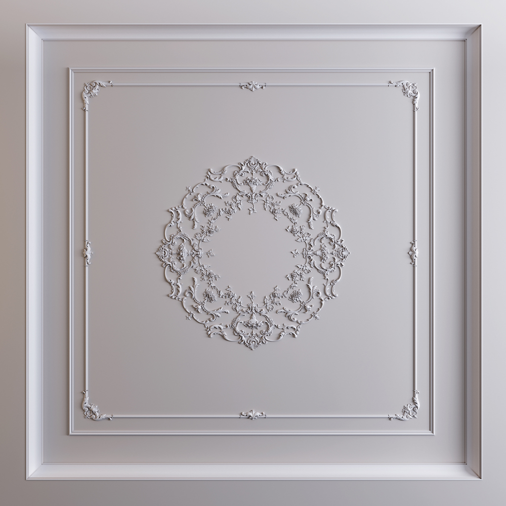 Орнаментальная композиция CPU-066 выполнена в стиле высокого барокко с элементами рококо, что делает его универсальным для классических и неоклассических интерьеров. Центральный мотив представляет собой стилизованную розетку, окруженную симметричными завитками аканта и виноградной лозы.