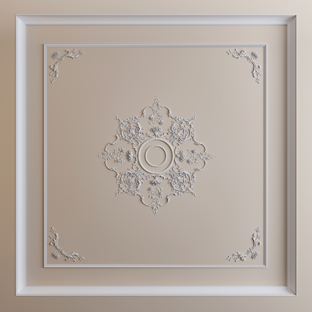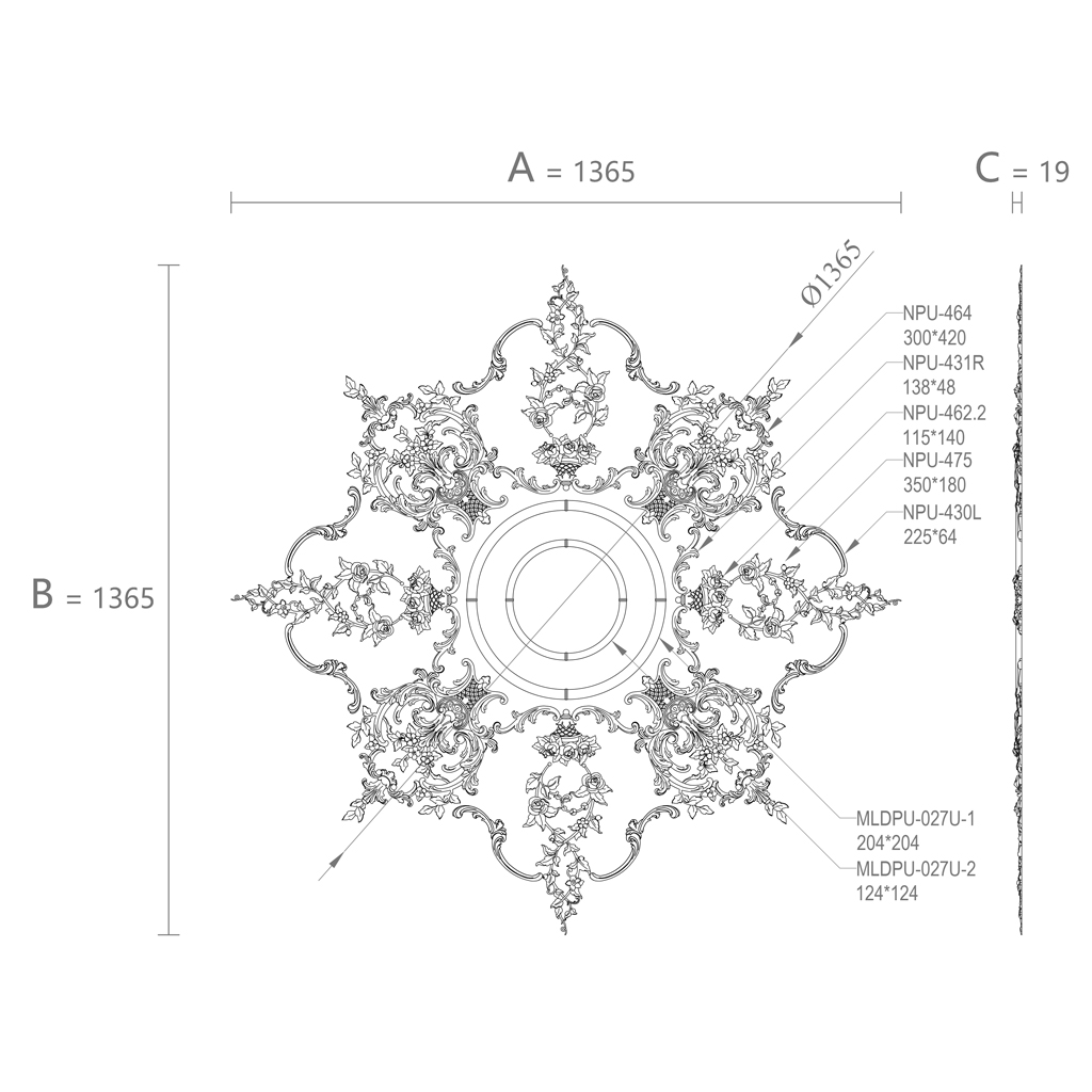 Модель CPU-071 относится к категории крупноформатных потолочных розеток с габаритами 1365 × 1365 × 19 миллиметров. Квадратная форма изделия с вписанной круглой композицией позволяет создавать выразительные декоративные решения в помещениях площадью от тридцати квадратных метров. Толщина элемента в девятнадцать миллиметров обеспечивает достаточную глубину рельефа для формирования насыщенного теневого рисунка, который выгодно подчёркивает сложность орнамента при различных сценариях освещения.